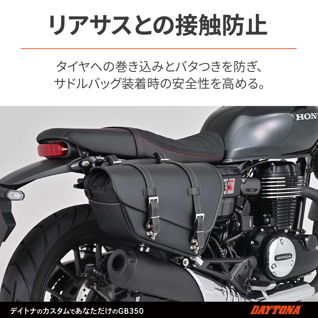 サドルバッグの安定性を高め、タイヤへの巻き込みを防ぐサポートバー。リアタイヤへの巻き込みを防止し、走行中の不安や危険を解消。バッグサポートバーにより、サドルバッグがリアサスペンション、リアアクスルに接触しにくい形状に設計。ベルトループ一体型で、別途サドルバッグハンガーを用意する必要なし。ベルトループはネット用のフックとしても使用可能。サドルバッグのベルト左右ピッチ200mm前後のバッグに対応。マルチウイングキャリア(品番:24599)との同時装着可能。【適合車種】GB350S(21-23)【2BL-NC59、8BL-NC59】 ※GB350適合不可となりますご注意ください。Sモデルのみの適合です。・推奨バッグ:スラッシャー DHS-39右側(品番:40413)、ツールバッグ DHS-7(品番:98771) / DHS-8(品番:98773)【適合車種】GB350S(21-23)右側専用 ※GB350適合不可となりますご注意ください。Sモデルのみの適合です。バッグのリアタイヤへの巻き込みを防止し、走行中の不安や危険を解消ベルトループはネット用のフックとしても使用可能推奨バッグ:スラッシャーDHS-39右側(品番:40413)、ツールバッグDHS-7(品番:98771) / DHS-8(品番:98773)マルチウイングキャリア(品番:24599)との同時装着可能※マフラーとサドルバッグのクリアランスは50mm以上確保した状態でご使用ください。※マフラーの排気がサイドバッグに直撃しないサイズのサイドバッグを選択してください。※純正およびデイトナ社製以外のリアサスに交換している車両はサドルバッグサポート/サドルバッグを取り付けできない場合があります。