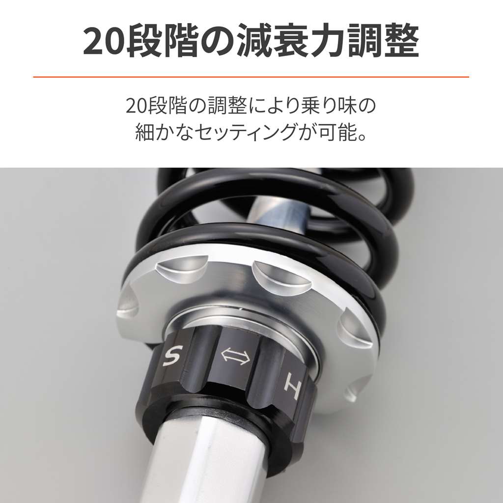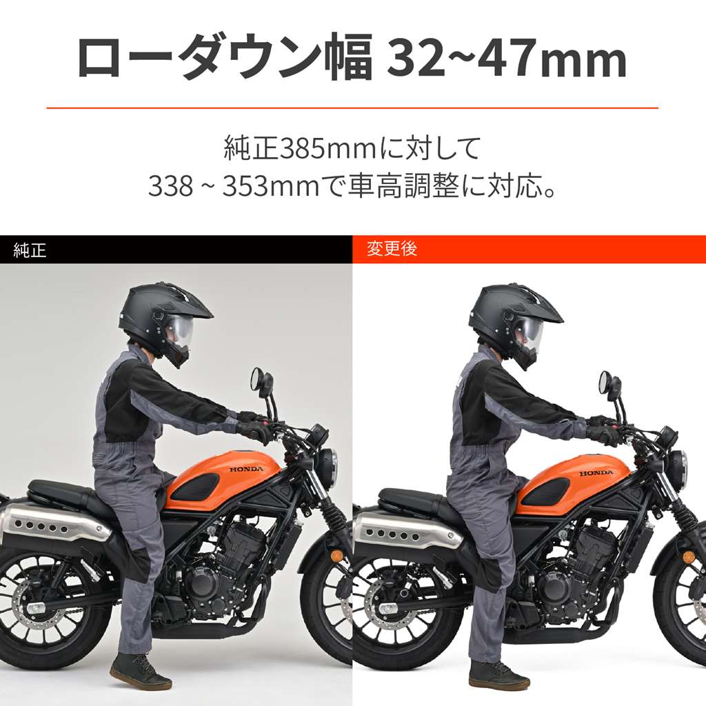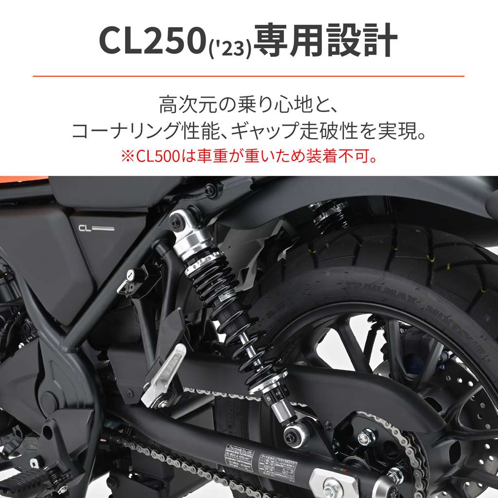 ローダウンして足つきの不安を解消。高次元の乗り心地、コーナリング性能、ギャップ走破性を実現したアジャスタブルリアショック。アルミ製で軽量化にも貢献。純正比-32〜-47mmの間で無段階に調整が可能。ローダウンによりシート高は28~42mm下がります。ローダウンに必要なショートサイドスタンドも付属。適合車種:CL250(23) 8BK-MC57ローダウンして足つきの不安を解消。シート高を約28〜42mmダウン車高調整幅(自由長):338-353mm(ノーマル長385mm)伸側減衰調整20段 / スプリングプリロード無段階調整式ショートサイドスタンド付属※CL500は車重が重いため装着不可。※リアショックは伸側減衰調整20段です。21段以上まで動きますが減衰力は変化しません。※車体姿勢が大きく変わるためヘッドライトの光軸調整が必要な場合があります。※ショートサイドスタンドには純正段付きボルトは使用不可。