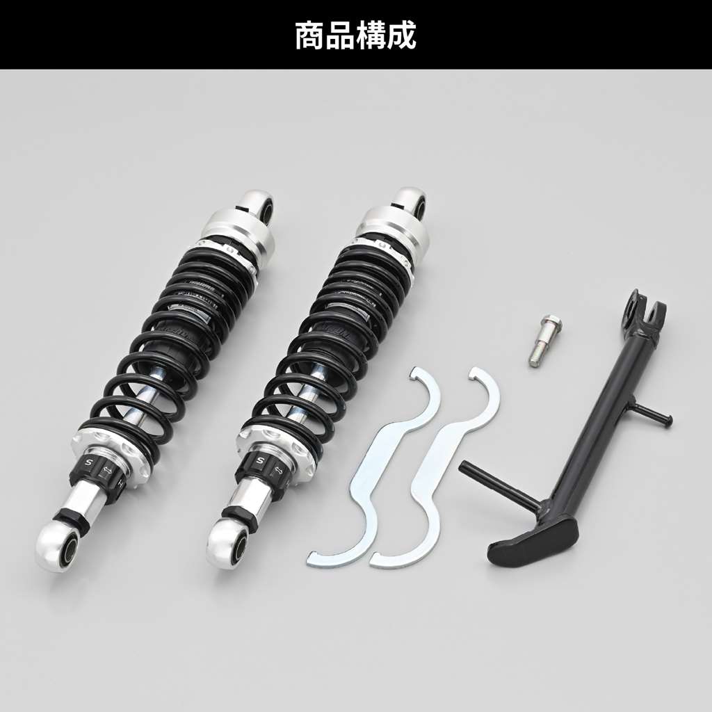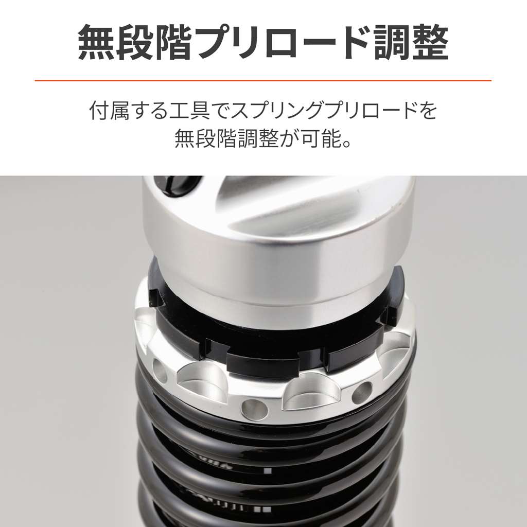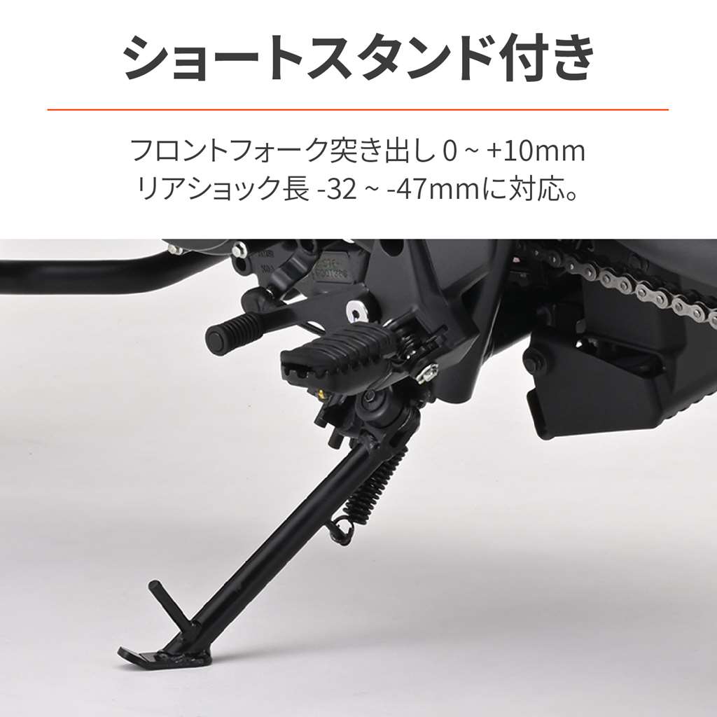 ローダウンして足つきの不安を解消。高次元の乗り心地、コーナリング性能、ギャップ走破性を実現したアジャスタブルリアショック。アルミ製で軽量化にも貢献。純正比-32〜-47mmの間で無段階に調整が可能。ローダウンによりシート高は28~42mm下がります。ローダウンに必要なショートサイドスタンドも付属。適合車種:CL250(23) 8BK-MC57ローダウンして足つきの不安を解消。シート高を約28〜42mmダウン車高調整幅(自由長):338-353mm(ノーマル長385mm)伸側減衰調整20段 / スプリングプリロード無段階調整式ショートサイドスタンド付属※CL500は車重が重いため装着不可。※リアショックは伸側減衰調整20段です。21段以上まで動きますが減衰力は変化しません。※車体姿勢が大きく変わるためヘッドライトの光軸調整が必要な場合があります。※ショートサイドスタンドには純正段付きボルトは使用不可。