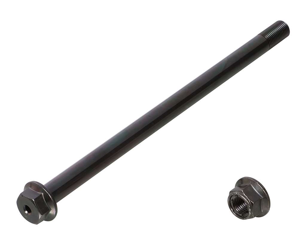 バネ下重量を軽減させる中空穴を空けた軽量アクスルシャフトです。スチール製(クロモリ鋼)/ブラック仕上げシャフト径:φ12中空穴径:φ5シャフト長(首下長さ):216mm重量(ナット含む):約193g(ノーマル:約226g)シャフト単体重量:約176g(ノーマル重量:約206g)適合純正品番:44301-GGE-900 / 42301-K88-L00