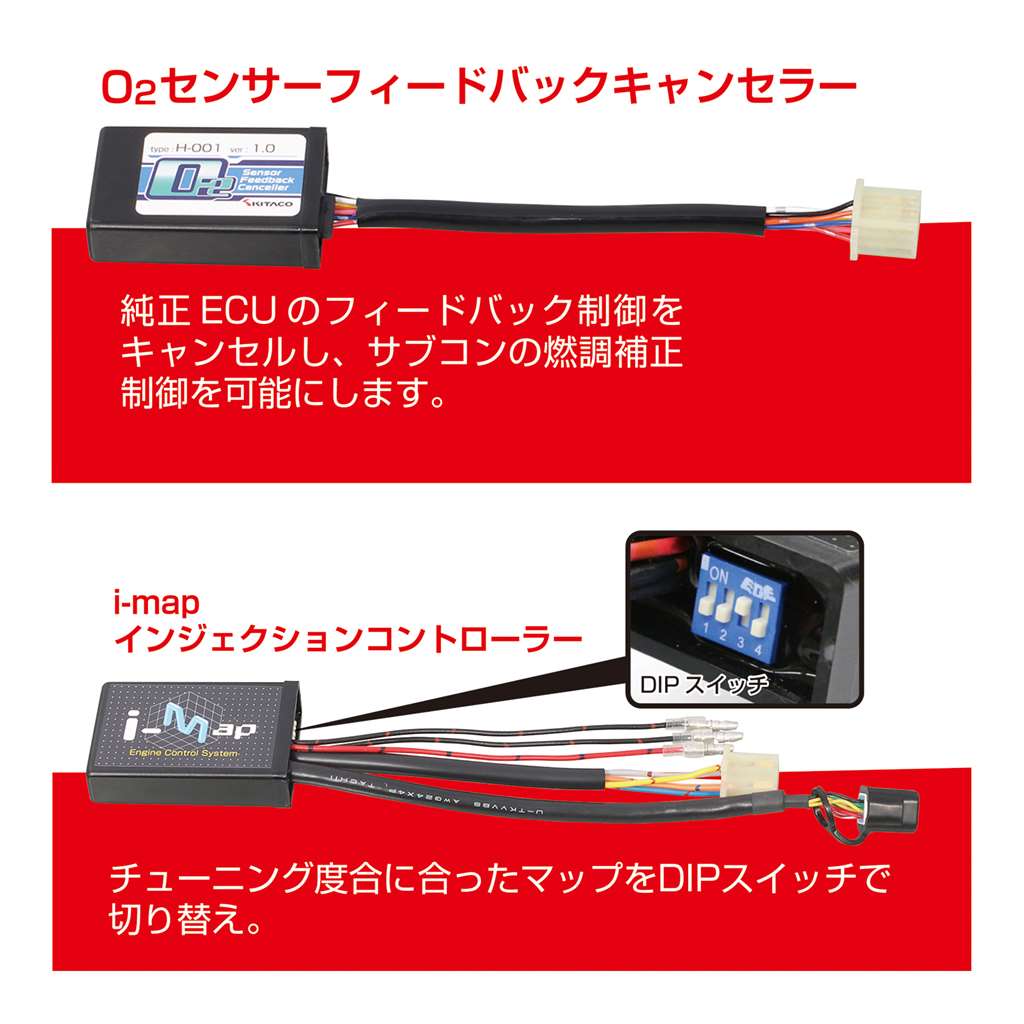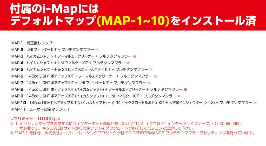 燃料噴射量を補正するFIコントローラーです。キタコ社製パーツの組み合わせに対応する複数の最適マップをインストール済みで、ユーザーはI-MAPを取り付けた後、スイッチの設定でマップを選択します。(マップ数は車種により異なります。)また、キタコ社製以外のパーツの装着やユーザーの好みに対応させるため、ユーザーオリジナルマップの作成も可能です。オリジナルマップの作成は別途PCインターフェイスケーブル(763-0500900)とwindows搭載のパソコンが必要です。新基準の排ガス規制対応車にも安定してI-MAPを作動させるO2フィードバックキャンセラーを付属。配線加工不要O2フィードバックキャンセラー付属車種専用カプラーオンハーネス付属※グロム(FNO,JC92-1100001〜8BJ-JC92モデル)は使用不可