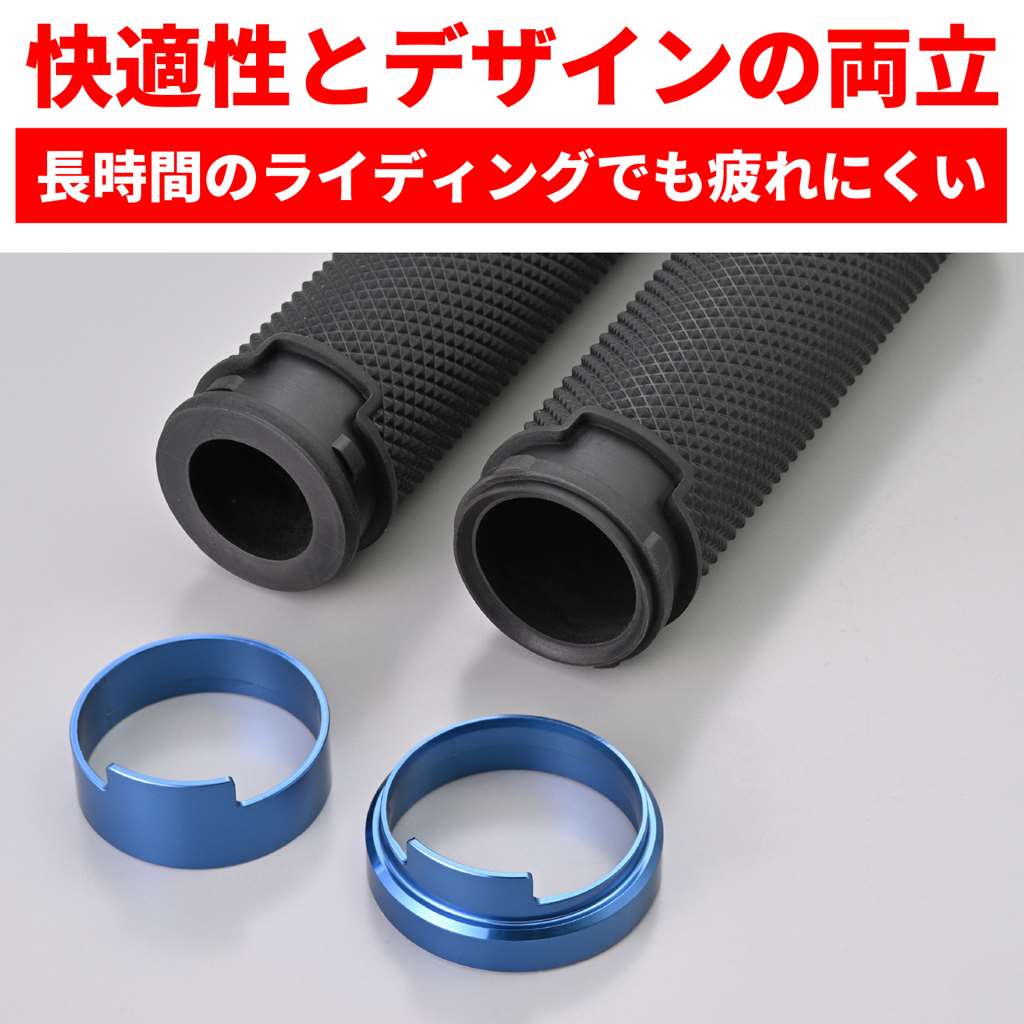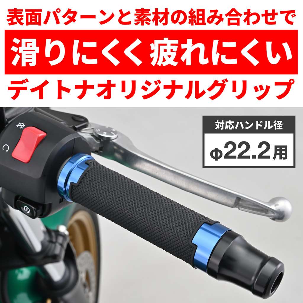 滑りにくく疲れにくいデイトナのオリジナルグリップ。アクセルを握ったとき滑りにくい表面パターンと、グリップ力に優れる素材を組み合わせて、長時間のライディングでも疲れにくいグリップに仕上げました。ドレスアップ効果の高いアルマイト仕上げのアルミリング付き。エンド貫通でバーエンド装着にも対応。φ22.2mmハンドル用グリップグリップ長:125mmエンド貫通タイプ表面パターンと素材により、疲れにくくグリップ力に優れるドレスアップ効果の高いアルミリング付き※純正スロットルスリーブにリブがある場合は、切削加工が必要です。 ※全長125mmです。スロットルスリーブとハンドル側の取り付けの寸法確認が必要です。※ご使用環境によっては、早期にアルミの腐食やアルマイトが劣化する場合があります。※φ25.4(1インチ)のハンドル採用車には取り付けできません。