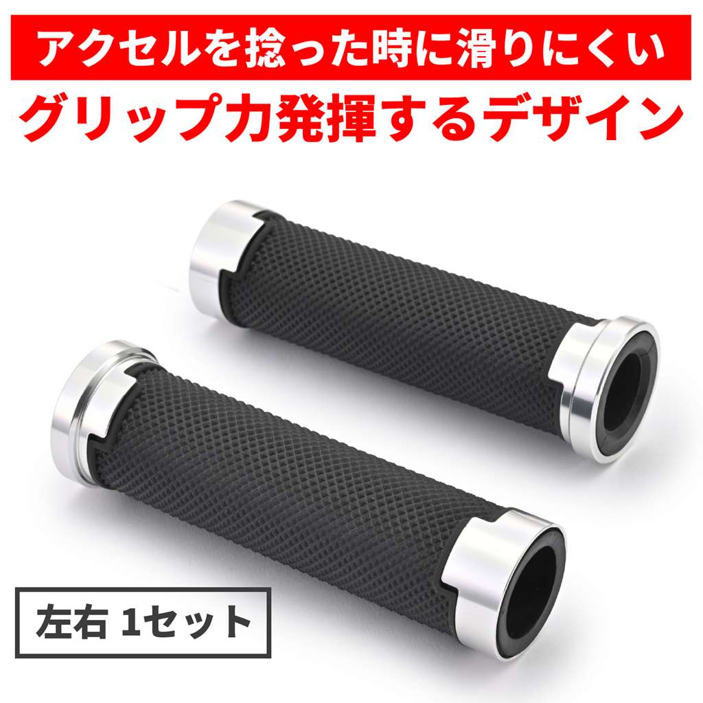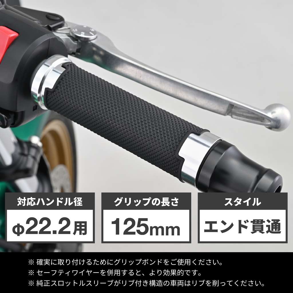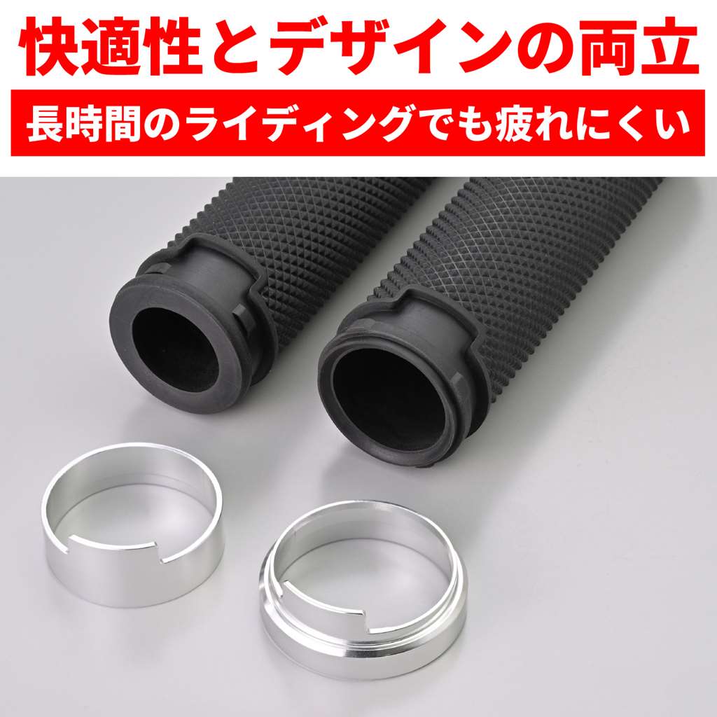 滑りにくく疲れにくいデイトナのオリジナルグリップ。アクセルを握ったとき滑りにくい表面パターンと、グリップ力に優れる素材を組み合わせて、長時間のライディングでも疲れにくいグリップに仕上げました。ドレスアップ効果の高いアルマイト仕上げのアルミリング付き。エンド貫通でバーエンド装着にも対応。φ22.2mmハンドル用グリップグリップ長:125mmエンド貫通タイプ表面パターンと素材により、疲れにくくグリップ力に優れるドレスアップ効果の高いアルミリング付き※純正スロットルスリーブにリブがある場合は、切削加工が必要です。 ※全長125mmです。スロットルスリーブとハンドル側の取り付けの寸法確認が必要です。※ご使用環境によっては、早期にアルミの腐食やアルマイトが劣化する場合があります。※φ25.4(1インチ)のハンドル採用車には取り付けできません。