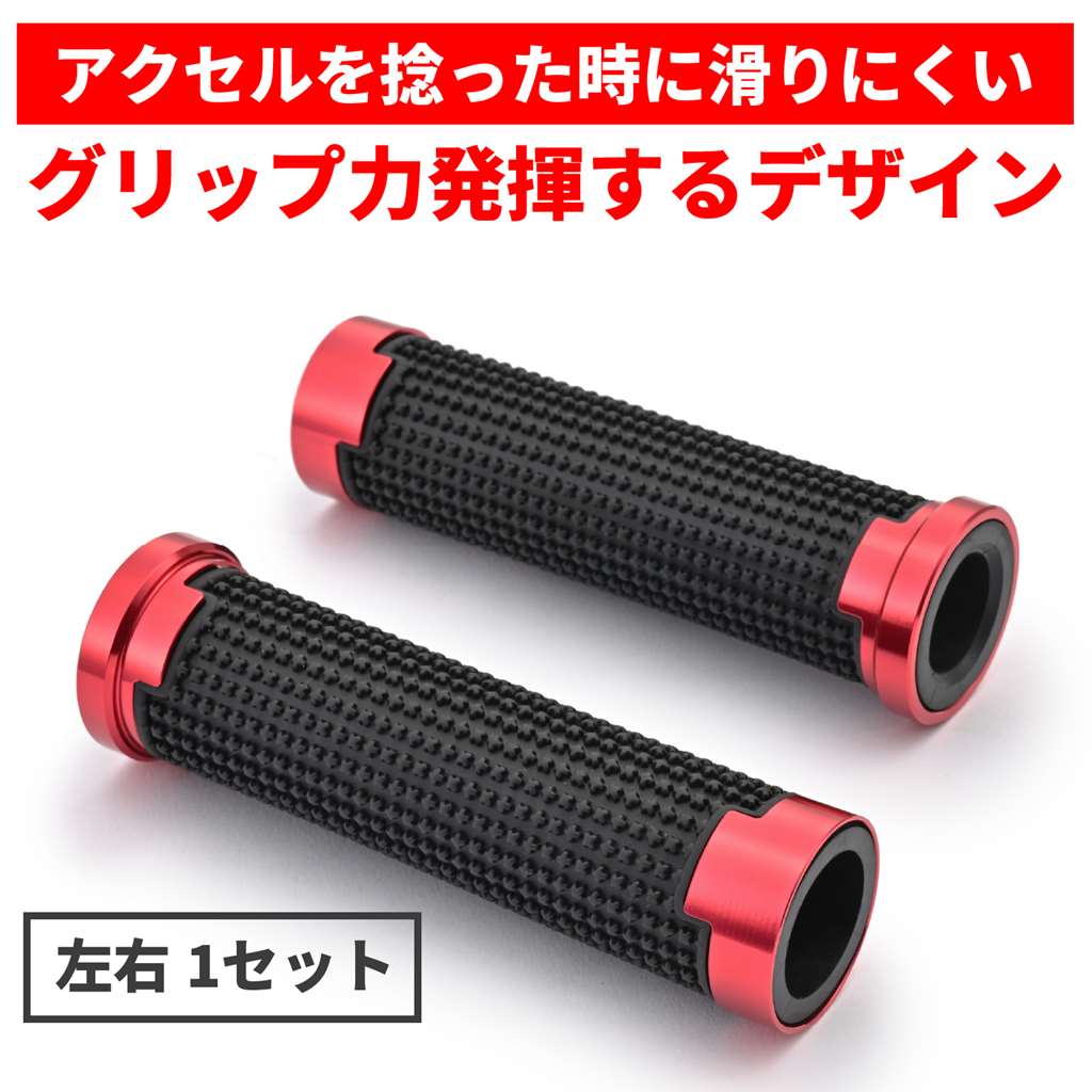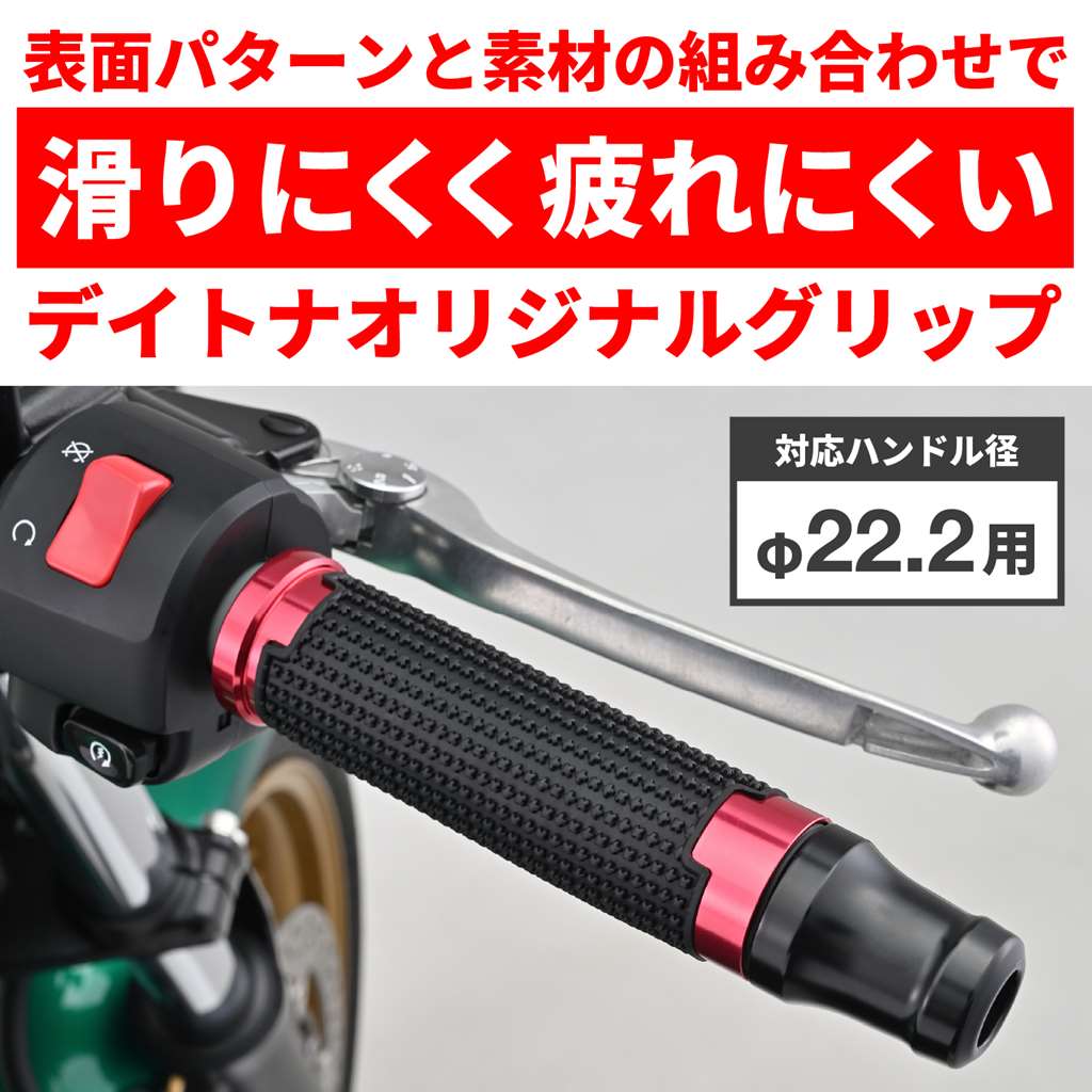 滑りにくく疲れにくいデイトナのオリジナルグリップ。アクセルを握ったとき滑りにくい表面パターンと、グリップ力に優れる素材を組み合わせて、長時間のライディングでも疲れにくいグリップに仕上げました。ドレスアップ効果の高いアルマイト仕上げのアルミリング付き。エンド貫通でバーエンド装着にも対応。φ22.2mmハンドル用グリップグリップ長:125mmエンド貫通タイプ表面パターンと素材により、疲れにくくグリップ力に優れるドレスアップ効果の高いアルミリング付き※純正スロットルスリーブにリブがある場合は、切削加工が必要です。 ※全長125mmです。スロットルスリーブとハンドル側の取り付けの寸法確認が必要です。※ご使用環境によっては、早期にアルミの腐食やアルマイトが劣化する場合があります。※φ25.4(1インチ)のハンドル採用車には取り付けできません。