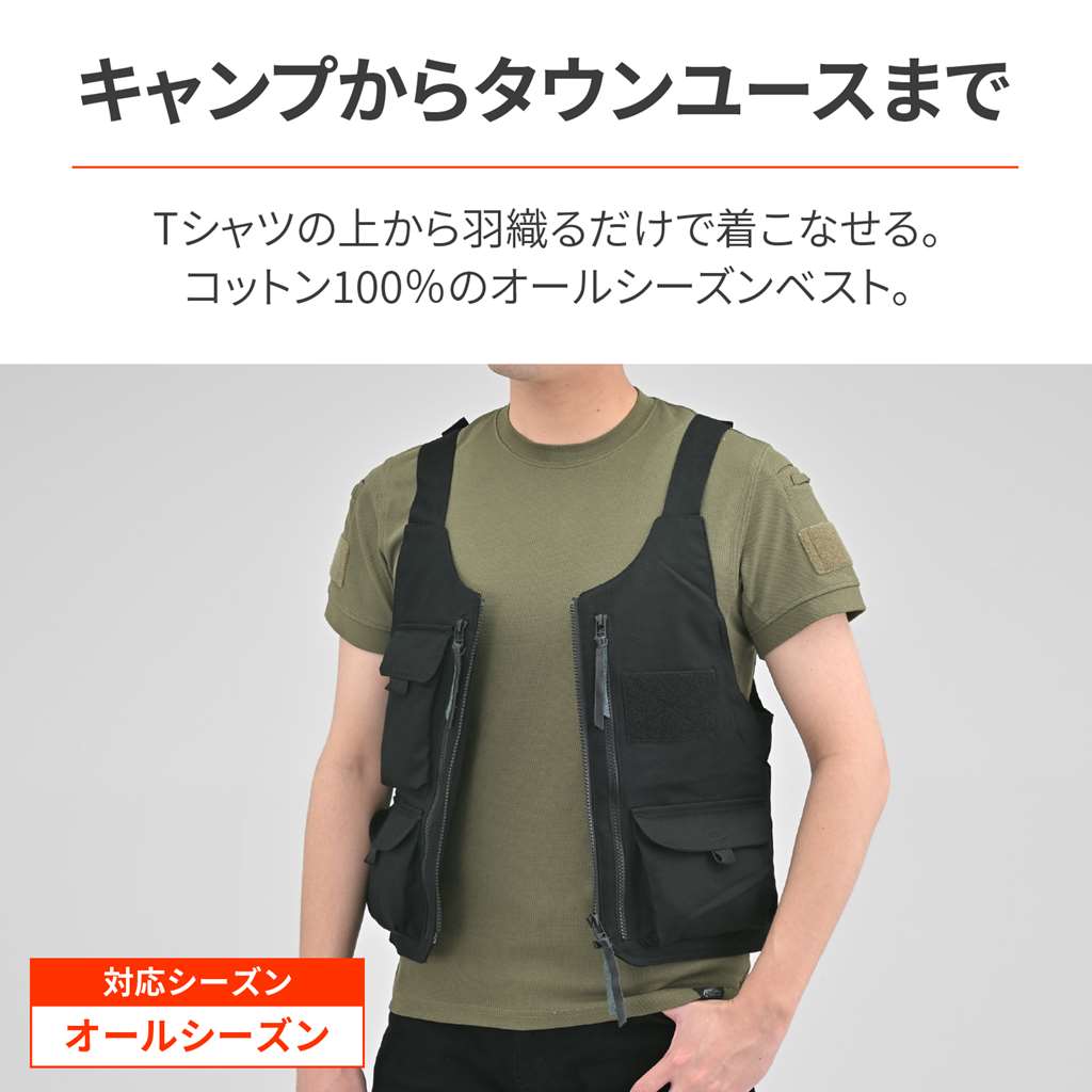 キャンプからタウンユースまで幅広く使えるアウトドアベスト。キャンプをしたいライダーのために、胸部と背中プロテクターを標準装備。SAS-TECプロテクターを採用しているため、普段やわらかく衝撃に応じて硬度変化する装着感の良いプロテクターが付属。プロテクターをつけたまま街中を歩けるように、プロテクターの装着感を抑えました。大型・小型のポケットを多数装備しているため、スマホからキャンプグッズまで手ぶらで持ち運びできます。ショルダーベルトによる高さ調整で、ピッタリサイズからラフな着こなしまでシーンに合わせて調整可能。・表生地:コットン100%キャンプからタウンユースまで幅広く使えるアウトドアベスト大型・小型のポケットを多数装備。スマホからキャンプグッズまで手ぶらで持ち運びSAS-TECの胸部と背中プロテクターが付属普段やわらかく衝撃に応じて硬度変化する装着感の良いプロテクターショルダーベルトにより、シーンに合わせて高さ調整可能