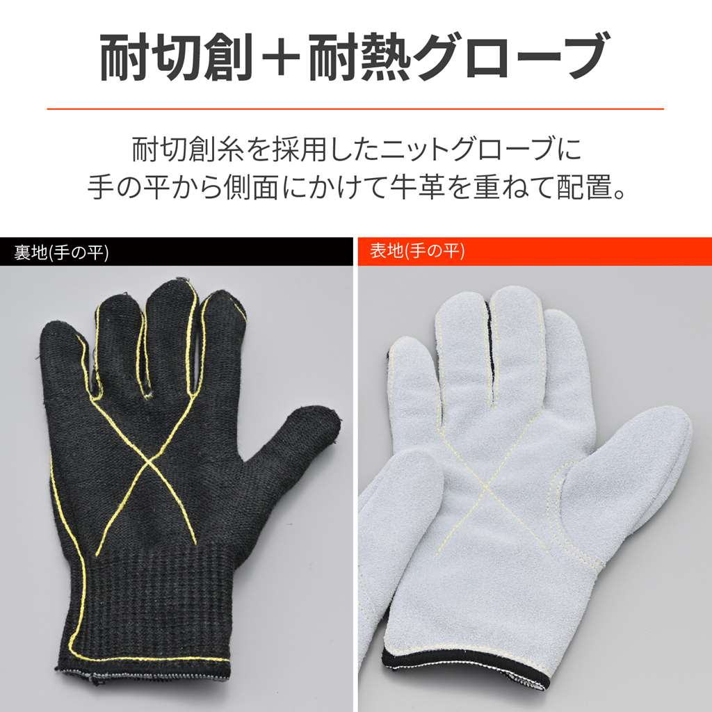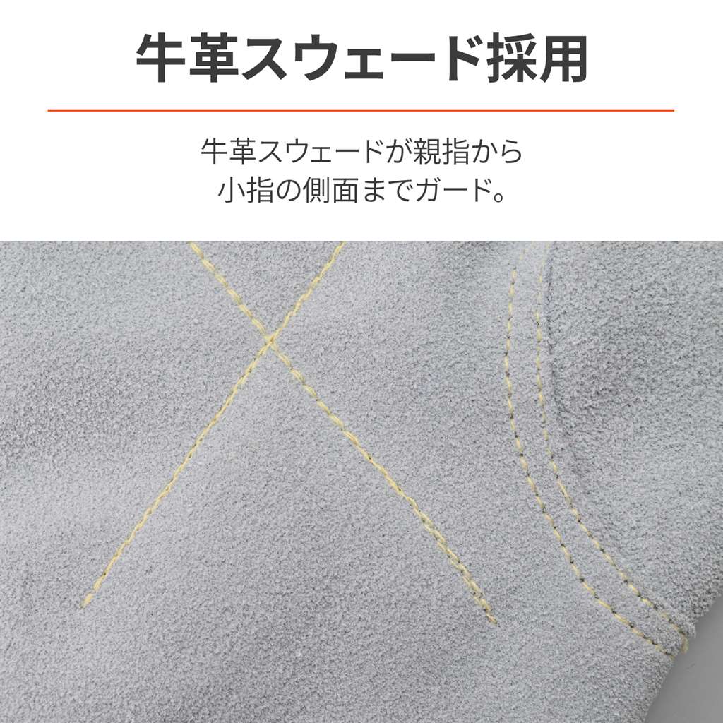 焚火や調理に便利なキャンプグローブ。薪割りなどキャンプ場で起こりやすい手のケガから守るため、耐切創糸で作られたニット生地を採用。手の平側は牛革スウェードを上から張り合わせることで、耐熱性を確保。鍋つかみとしても使えます。材質/平側:牛本革ニット部:ポリアラミド 70%、ポリエステル 15%、コットン 10%、ステンレス・その他 5%焚火や調理に便利なキャンプグローブベースのニット部分はケガ防止に役立つ耐切創糸を採用手の平側は牛革スウェードとの二重構造で耐熱性も確保材質/平側:牛本革、ニット部:ポリアラミド 70%、ポリエステル 15%、コットン 10%、ステンレス・その他 5%※洗濯不可
