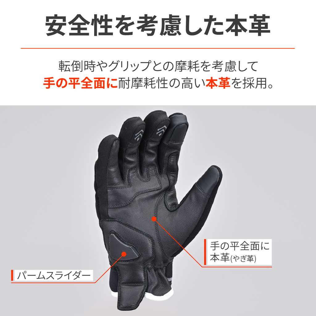 フィット感を重視した操作性の高いソフトフィットグローブ。転倒時もっとも接地しやすい手の平側は、本革を使い摩耗性と耐久性を確保。柔らかい質感ながら、シンサレート中綿と防風防水透湿フィルム入りで暖かいウインターグローブ。シーズン:秋冬フィット感を重視したソフトフィットグローブ手の平に本革採用で、グリップとの摩耗に強くなり安全性を向上防風防水透湿フィルム+シンサレート中綿で暖かいタッチパネル対応。人差し指は側面まで対応することで操作性向上※タッチパネル対応はグローブへの密着度や個人差により感度にばらつきがあります。※経年劣化や使用状況により防水フィルムが破損することがあります。