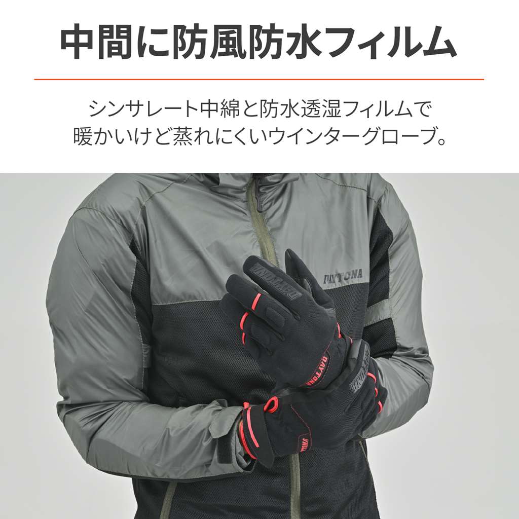 フィット感を重視した操作性の高いソフトフィットグローブ。転倒時もっとも接地しやすい手の平側は、本革を使い摩耗性と耐久性を確保。柔らかい質感ながら、シンサレート中綿と防風防水透湿フィルム入りで暖かいウインターグローブ。シーズン:秋冬フィット感を重視したソフトフィットグローブ手の平に本革採用で、グリップとの摩耗に強くなり安全性を向上防風防水透湿フィルム+シンサレート中綿で暖かいタッチパネル対応。人差し指は側面まで対応することで操作性向上※タッチパネル対応はグローブへの密着度や個人差により感度にばらつきがあります。※経年劣化や使用状況により防水フィルムが破損することがあります。