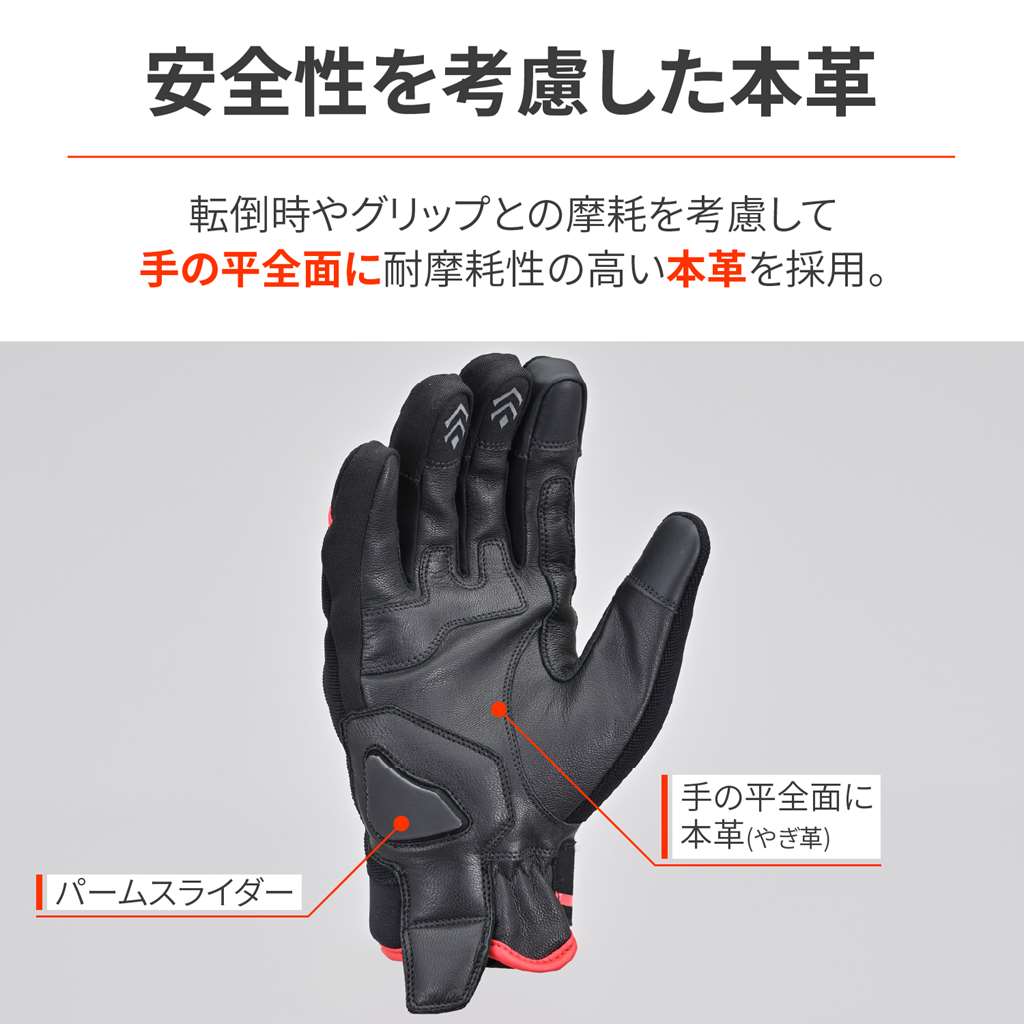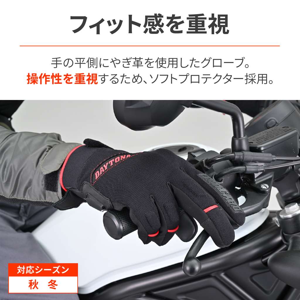 フィット感を重視した操作性の高いソフトフィットグローブ。転倒時もっとも接地しやすい手の平側は、本革を使い摩耗性と耐久性を確保。柔らかい質感ながら、シンサレート中綿と防風防水透湿フィルム入りで暖かいウインターグローブ。シーズン:秋冬フィット感を重視したソフトフィットグローブ手の平に本革採用で、グリップとの摩耗に強くなり安全性を向上防風防水透湿フィルム+シンサレート中綿で暖かいタッチパネル対応。人差し指は側面まで対応することで操作性向上※タッチパネル対応はグローブへの密着度や個人差により感度にばらつきがあります。※経年劣化や使用状況により防水フィルムが破損することがあります。