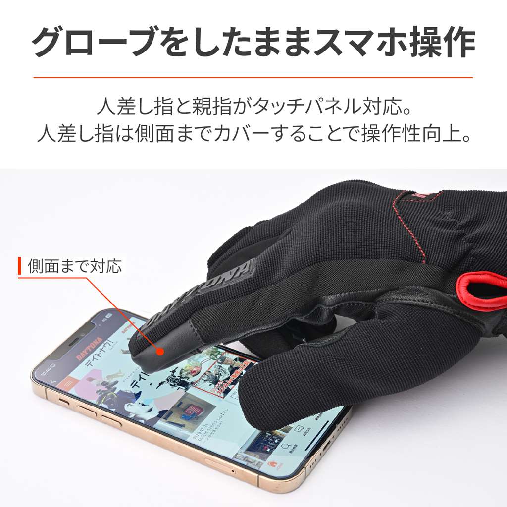フィット感を重視した操作性の高いソフトフィットグローブ。転倒時もっとも接地しやすい手の平側は、本革を使い摩耗性と耐久性を確保。柔らかい質感ながら、シンサレート中綿と防風防水透湿フィルム入りで暖かいウインターグローブ。シーズン:秋冬フィット感を重視したソフトフィットグローブ手の平に本革採用で、グリップとの摩耗に強くなり安全性を向上防風防水透湿フィルム+シンサレート中綿で暖かいタッチパネル対応。人差し指は側面まで対応することで操作性向上※タッチパネル対応はグローブへの密着度や個人差により感度にばらつきがあります。※経年劣化や使用状況により防水フィルムが破損することがあります。
