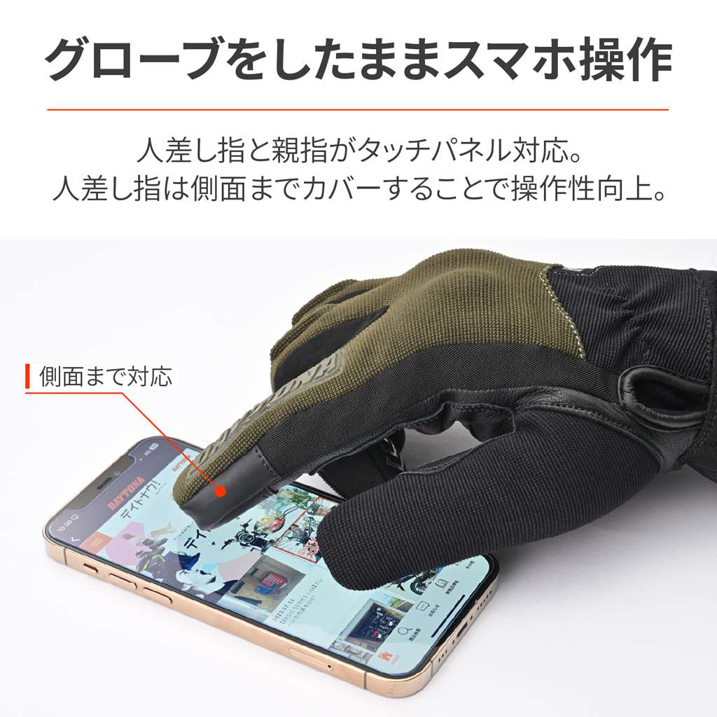 フィット感を重視した操作性の高いソフトフィットグローブ。転倒時もっとも接地しやすい手の平側は、本革を使い摩耗性と耐久性を確保。柔らかい質感ながら、シンサレート中綿と防風防水透湿フィルム入りで暖かいウインターグローブ。シーズン:秋冬フィット感を重視したソフトフィットグローブ手の平に本革採用で、グリップとの摩耗に強くなり安全性を向上防風防水透湿フィルム+シンサレート中綿で暖かいタッチパネル対応。人差し指は側面まで対応することで操作性向上※タッチパネル対応はグローブへの密着度や個人差により感度にばらつきがあります。※経年劣化や使用状況により防水フィルムが破損することがあります。