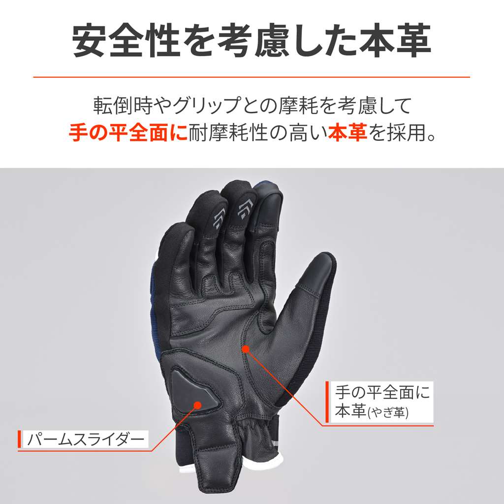 フィット感を重視した操作性の高いソフトフィットグローブ。転倒時もっとも接地しやすい手の平側は、本革を使い摩耗性と耐久性を確保。柔らかい質感ながら、シンサレート中綿と防風防水透湿フィルム入りで暖かいウインターグローブ。シーズン:秋冬フィット感を重視したソフトフィットグローブ手の平に本革採用で、グリップとの摩耗に強くなり安全性を向上防風防水透湿フィルム+シンサレート中綿で暖かいタッチパネル対応。人差し指は側面まで対応することで操作性向上※タッチパネル対応はグローブへの密着度や個人差により感度にばらつきがあります。※経年劣化や使用状況により防水フィルムが破損することがあります。