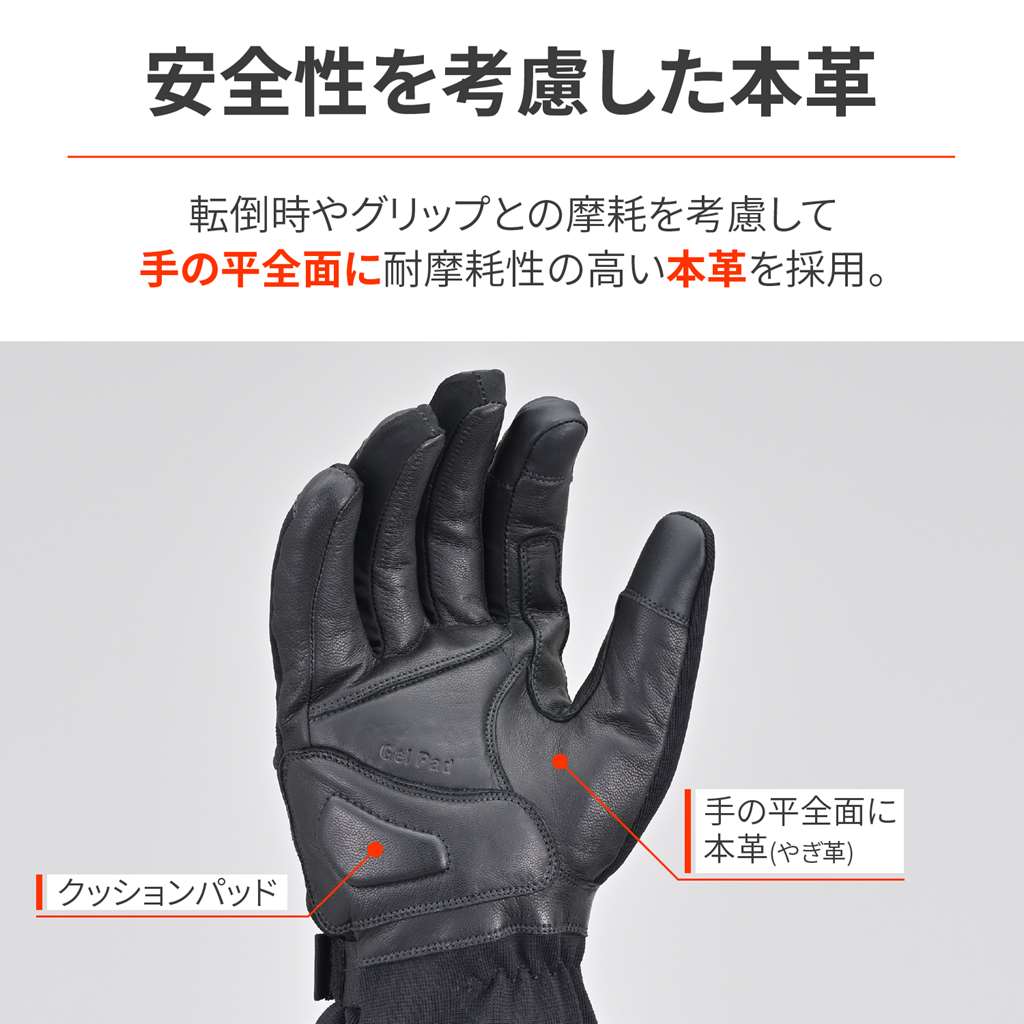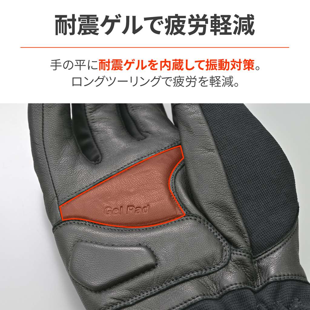 ロング丈で防寒性が高く、ソフトナックルプロテクターを内側にインサートし、安全性と高い操作性を実現。転倒時もっとも接地しやすい手の平側は、本革を使い摩耗性と耐久性を確保。ドローコードで手首からの冷風の侵入を防ぎます。余ったドローコードはパルステープに留めておくことでバタつきを防止。手の平には耐震ゲルをインサートし、ロングツーリングにも最適。防風防水透湿フィルム入り。シーズン:秋冬ドローコードで手首からの冷風の侵入を防ぎ、防?防水透湿フィルムが防風効果を発揮手の平に本革採用で、グリップとの摩耗に強くなり安全性を向上手の平に耐震ゲルを内蔵して振動対策。ロングツーリングでの疲労軽減タッチパネル対応。人差し指は側面まで対応することで操作性向上※タッチパネル対応はグローブへの密着度や個人差により感度にばらつきがあります。※経年劣化や使用状況により防水フィルムが破損することがあります。