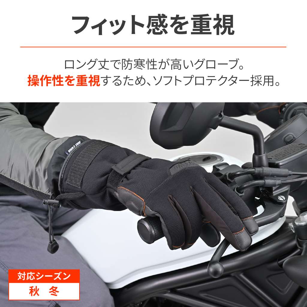 ロング丈で防寒性が高く、ソフトナックルプロテクターを内側にインサートし、安全性と高い操作性を実現。転倒時もっとも接地しやすい手の平側は、本革を使い摩耗性と耐久性を確保。ドローコードで手首からの冷風の侵入を防ぎます。余ったドローコードはパルステープに留めておくことでバタつきを防止。手の平には耐震ゲルをインサートし、ロングツーリングにも最適。防風防水透湿フィルム入り。シーズン:秋冬ドローコードで手首からの冷風の侵入を防ぎ、防?防水透湿フィルムが防風効果を発揮手の平に本革採用で、グリップとの摩耗に強くなり安全性を向上手の平に耐震ゲルを内蔵して振動対策。ロングツーリングでの疲労軽減タッチパネル対応。人差し指は側面まで対応することで操作性向上※タッチパネル対応はグローブへの密着度や個人差により感度にばらつきがあります。※経年劣化や使用状況により防水フィルムが破損することがあります。