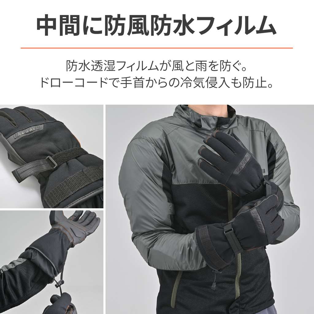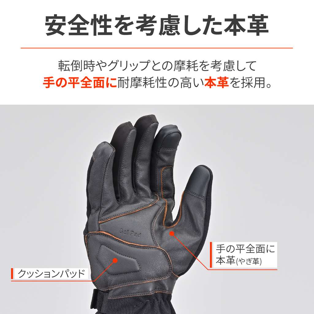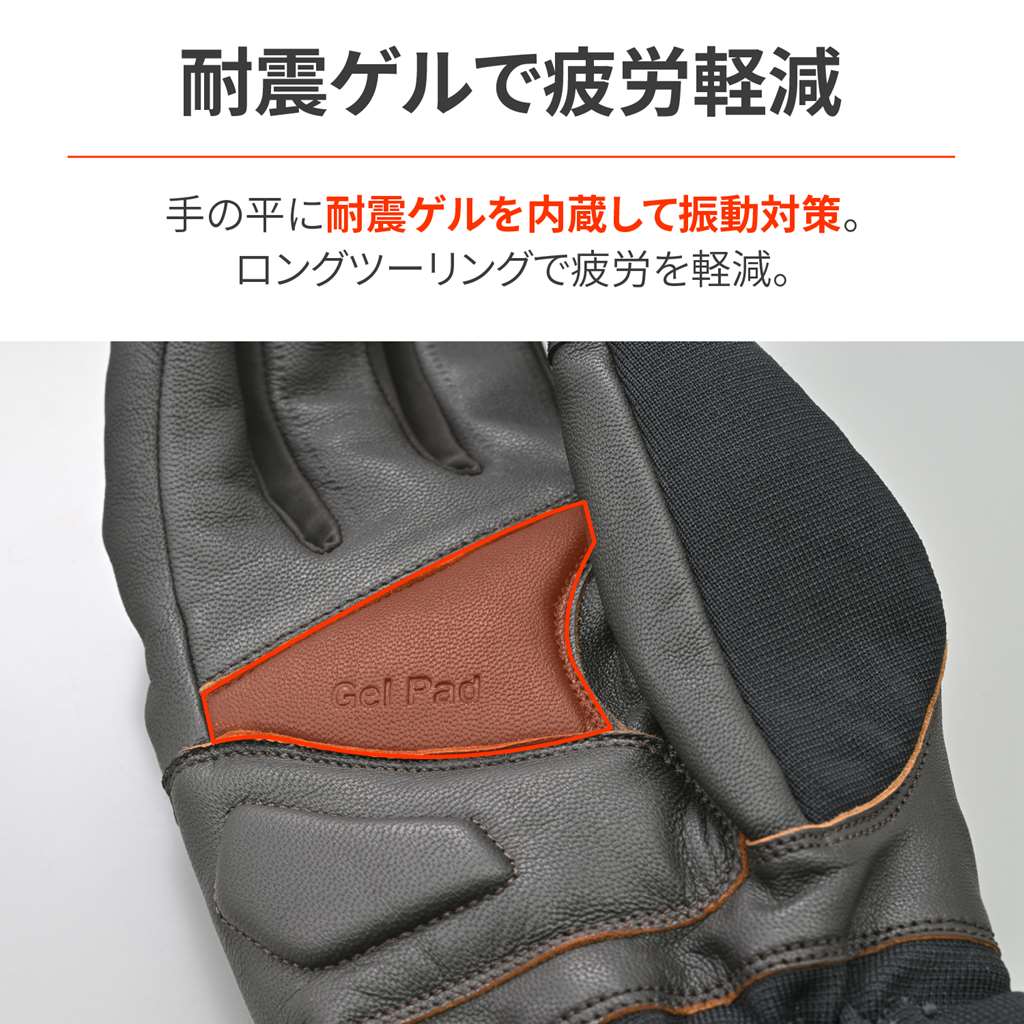 ロング丈で防寒性が高く、ソフトナックルプロテクターを内側にインサートし、安全性と高い操作性を実現。転倒時もっとも接地しやすい手の平側は、本革を使い摩耗性と耐久性を確保。ドローコードで手首からの冷風の侵入を防ぎます。余ったドローコードはパルステープに留めておくことでバタつきを防止。手の平には耐震ゲルをインサートし、ロングツーリングにも最適。防風防水透湿フィルム入り。シーズン:秋冬ドローコードで手首からの冷風の侵入を防ぎ、防?防水透湿フィルムが防風効果を発揮手の平に本革採用で、グリップとの摩耗に強くなり安全性を向上手の平に耐震ゲルを内蔵して振動対策。ロングツーリングでの疲労軽減タッチパネル対応。人差し指は側面まで対応することで操作性向上※タッチパネル対応はグローブへの密着度や個人差により感度にばらつきがあります。※経年劣化や使用状況により防水フィルムが破損することがあります。