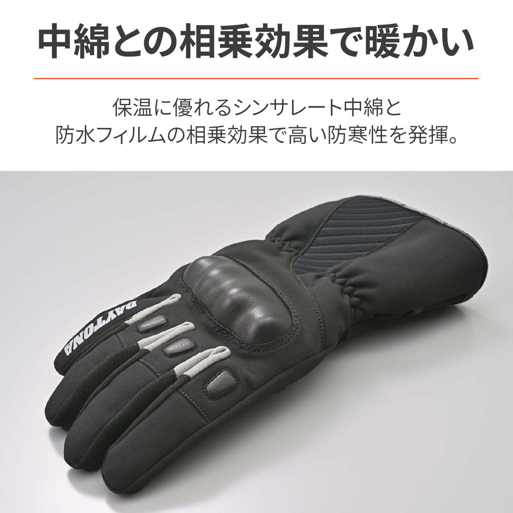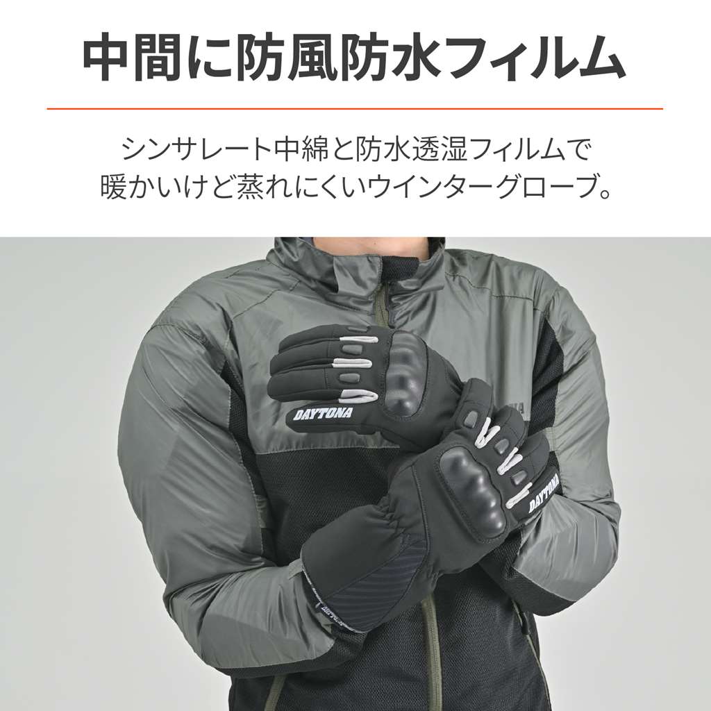 ハードナックルプロテクター付きモデル。防風防水透湿フィルムにより急な雨にも安心。フィルムの防風効果と中綿に採用した保温性に優れるシンサレートとの相乗効果で抜群の防寒性を発揮します。袖口にも面ファスナーバンドを採用し、より安心して使えるウインターグローブ。シーズン:秋冬防?防水透湿フィルムにより雨と風を防ぐロング丈グローブが手首までガードし、防寒効果を発揮プロテクト効果の高いハードナックルプロテクターを装備※経年劣化や使用状況により防水フィルムが破損することがあります。