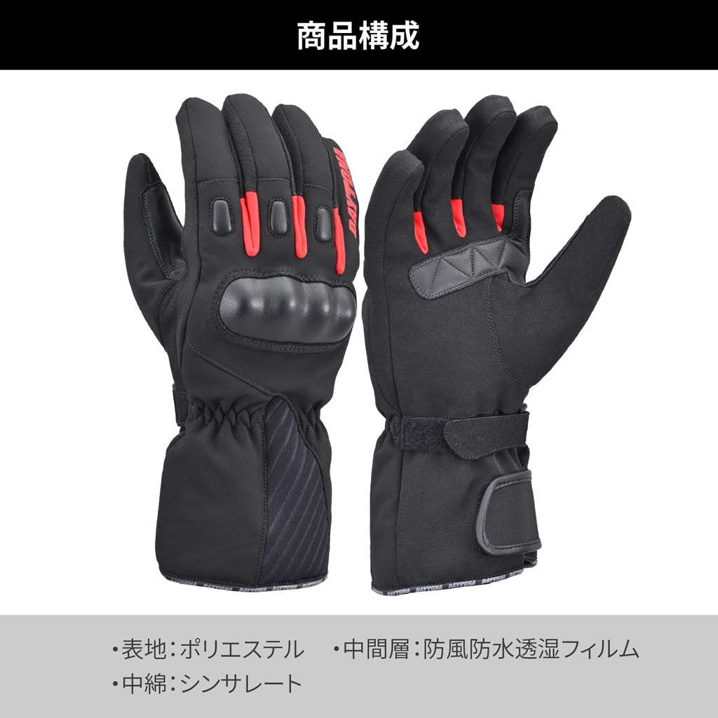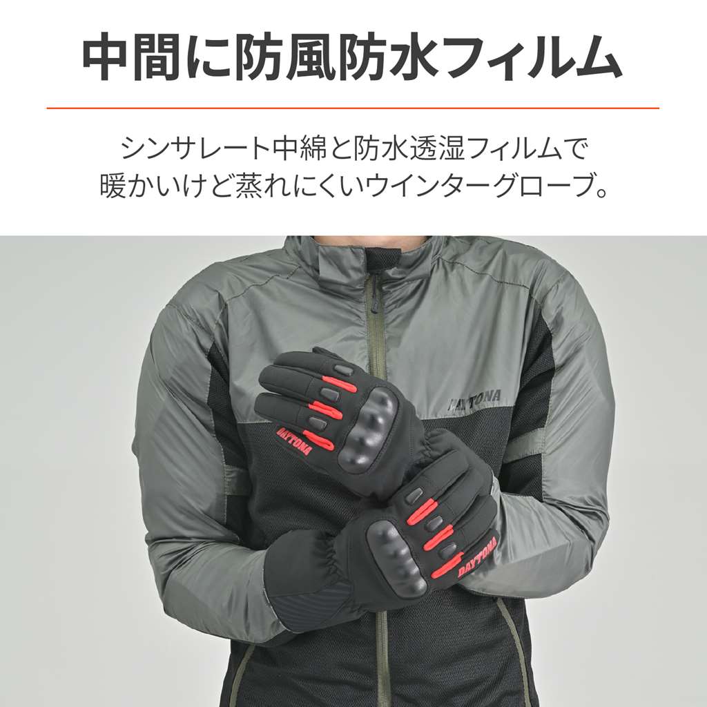 ハードナックルプロテクター付きモデル。防風防水透湿フィルムにより急な雨にも安心。フィルムの防風効果と中綿に採用した保温性に優れるシンサレートとの相乗効果で抜群の防寒性を発揮します。袖口にも面ファスナーバンドを採用し、より安心して使えるウインターグローブ。シーズン:秋冬防?防水透湿フィルムにより雨と風を防ぐロング丈グローブが手首までガードし、防寒効果を発揮プロテクト効果の高いハードナックルプロテクターを装備※経年劣化や使用状況により防水フィルムが破損することがあります。