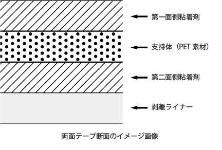 特殊粘着剤を使用することで経時変化による粘着性能の低下を抑えると同時に、粘着剤の間にPET素材を挟むことで水分の浸透を防ぐという特徴があります。