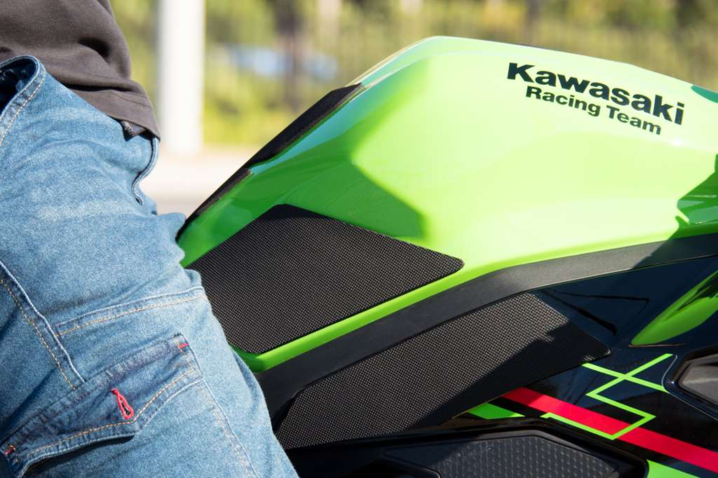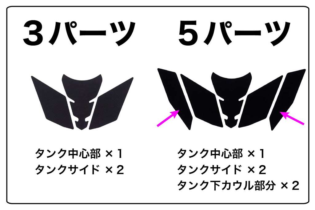 ・表面形状:ノンスリップ(スクエアブロック)・カラー:ブラック・素材:中硬度EPDM系ゴム・厚さ:3mm・付属品:マニュアル・日本製設計から製造までを一貫して日本国内で行う「G2プロテクションタンクパッド」。商品名のG2とは、本商品の役割である「GRIP(タンクをとらえる)」と「GUARD(傷から守る)」からつけられました。車種ごとに一から型を作製した専用設計商品のため、ZX-4R SE・ZX-4RRの車体にもすんなり馴染みます。車種別専用設計本商品は車種別専用設計のため、貼り付けた際の一体感は抜群です。 また製造を日本国内で行うことにもこだわりました。諸外国と比較してもゴム製品の品質において日本はトップクラスだからです。その中でも豊富な経験とノウハウを持つ工場に製造を依頼しました。ノンスリップ形状滑り止め効果を発揮する連続した凹凸面。グリップ力が向上すると共に適度な硬さはホールド時の負担を軽減させます。引き裂き強度にも優れた素材です。ニーグリップをよりし易くしっかりとニーグリップのサポートをしてくれるので、コーナーでは安定した動作が可能になります。直進時も軽い力でニーグリップできるようになるので高速道路などの長距離走行が楽になったというお客様の声も届いております。優れた粘着面タンクパッド裏の両面テープにはカッティングシートでも有名なTOYO-CHEMが開発に携わった新素材を使用しています。特殊粘着剤を使用することで経時変化による粘着性能の低下を抑えると同時に、粘着剤の間にPET素材を挟むことで水分の浸透を防ぐという特徴があります。(上図参照)屋外使用に適した素材中硬度ゴムの一般特性と仕様です。各種試験項目をクリアしているのはもちろんのこと、季節天候問わず使用する上で重要な耐候性、耐オゾン性にも優れます。タンクを傷からガード大切に扱っていても気づくとついているタンクの傷。上着・ズボンの金具による擦れや、洗車、バイクカバーの脱着でもその傷は増えていきます。本商品は日常的な使用によってついてしまう傷からボディを保護します。2パターンのセット内容をご用意しております。タンク中央・タンクサイドの2箇所を保護してくれる3パーツ版。タンク中央・タンクサイドに加えてタンク下のカウル部分まで保護してくれる5パーツ版と2種類の組み合わせをご用意しております。お好きな組み合わせをお選びください。※デザイン・仕様は予告なく変更されることがございます。予めご了承ください。※ご自身でお取り付けを行った場合はいかなる場合も保証の対象外となります。恐れ入りますがご了承ください。
