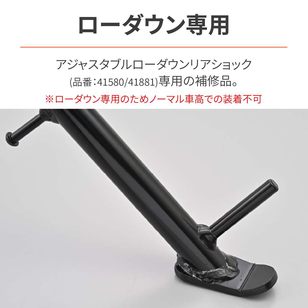ローダウンキット(品番:41580/41881)の補修用ショートサイドスタンド。フロントフォーク突き出し0ー10mm、リアショック長338-353mmに対応。ローダウンキットを使用した際、純正サイドスタンドでは車体が立気味になるのを改善します。ローダウンキットの補修用ショートサイドスタンドフロントフォーク突き出し0-10mm、リアショック長338-353mmまで対応※純正段付きボルトは使用不可