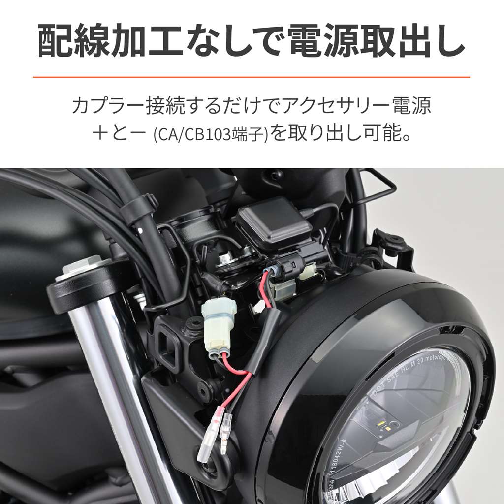 車種専用設計だから、カプラーオンでACC電源が取り出し可能。配線を加工することなくカプラーを接続するだけで簡単に+と?の配線を取り出すことができる電源取出しハーネス。イグニッションキーのON/OFFに連動し、キーOFFで電源がカットされるので、スマートフォンやナビへの給電に便利です。分かりやすい取扱説明書付きで、初心者でも安心して取り付けできます。カプラーオンでメーターバイザー下からACC電源取り出しイグニッションキーに連動説明書に車種ごとの取付方法付きACC取り出し線接続部:CA/CB103 / 許容電力:12V/3A※バッテリー直接接続の商品には対応していません。※バイク専用電源の種類によっては、接続部分をギボシに変更する必要があります。※装着する電装品のスペックを必ずご確認ください。※車両により配線加工が必要になる場合があります。※標準のギボシのタイプはCA/CB103タイプです。