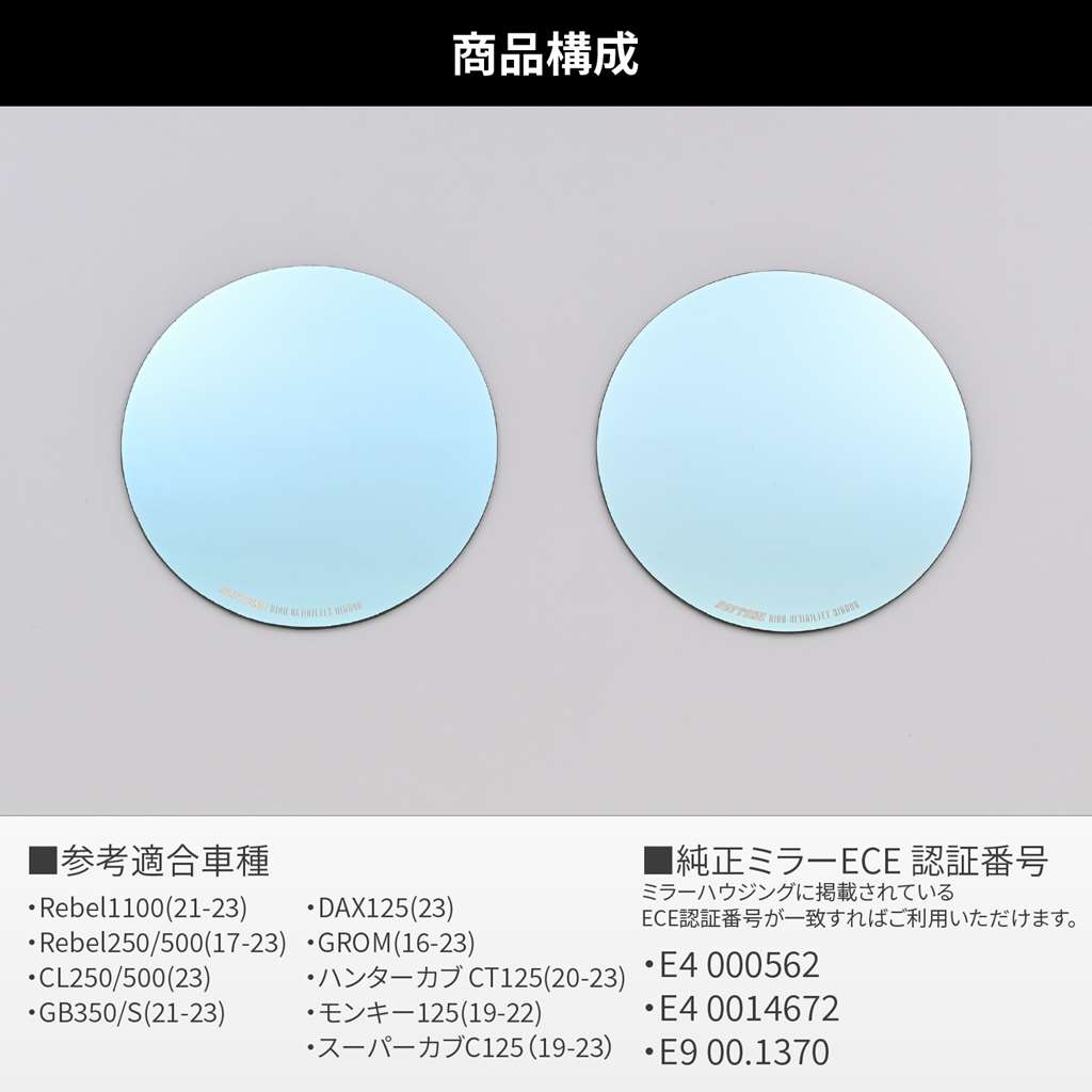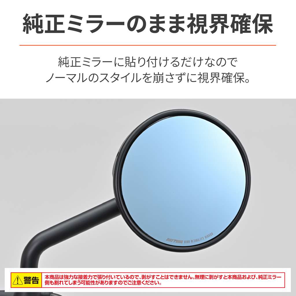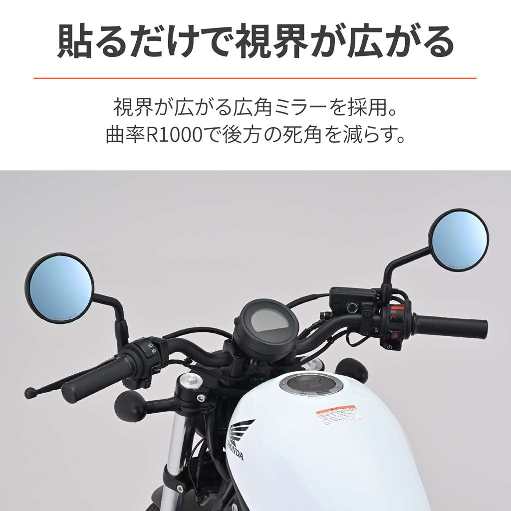 貼るだけで視界が広く、見やすいハイビジミラー。純正よりも視界が広がる曲率R1000の広角ミラーで後方の死角を減らします。防眩効果のあるブルーミラーを採用し、ヘッドライトによる眩しさを軽減。純正ミラーに貼り付けるだけなので、ノーマルのスタイルを崩さずに視界を確保します。【純正ミラーECE 認証番号】E4 000562E4 0014672E9 00.1370ミラーハウジングに掲載されているECE 認証番号が一致すれば、参考適合車種以外の車両にも取付が可能です。参考適合車種:レブル1100(2021-2023年)、レブル250/500(2017-2023年)、CL250/500(2023年)、GB350/S(2021-2023年)、ダックス125(2023年)、グロム(2016-2023年)、ハンターカブ CT125(2020-2023年)、モンキー125(2019-2022年)、スーパーカブ C125(2019-2023年)純正ミラーに貼り付けるだけで視界が広がる曲率R1000の広角ミラー防眩効果のあるブルーミラーを採用し、ヘッドライトによる眩しさを軽減純正ミラーECE 認証番号:E4 000562 / E4 0014672 / E9 00.1370 に適合新保安基準適合※本商品は強力な接着力で張り付いているので、剥がすことはできません。無理に剥がすと本商品および、純正ミラー側も割れてしまう可能性がありますのでご注意ください。※本商品はガラス製品のためケガ、割れなどお取り扱いには充分ご注意ください。※気温の低いときの施工は両面テープの接着力が低下しますので、ドライヤーなどで軽く暖めて作業することをおすすめします。※テープの完全接着までは(約24時間程度かかります)水濡れや激しい振動を与えないようにしてください。※車体側ミラーの製造誤差により、本商品との形状にズレが生じることがあります。ズレが生じた場合黒色油性マジックで車体側ミラー枠に沿って塗るとすき間が目立たなくなります。※本商品が車体側にはまらない場合は、車体側ミラーの縁をドライヤーなどで暖めるとはまりやすくなります。※強力両面テープを使用しておりますので、貼り直しはできません。位置決めなど慎重に行なうようにしてください。無理に剥がそうとした際は、ミラーの破損、ケガの恐れがあります。絶対に行なわないでください。※本商品は、ワイドミラータイプとなっております。遠近感が純正ミラーと異なります。慣れるまで慎重に運転するように心がけてください。※ミラーの縁は滑らかになっておりますが手を切ったりしないよう充分ご注意ください。※ミラー用のケミカル類は使用しないでください。