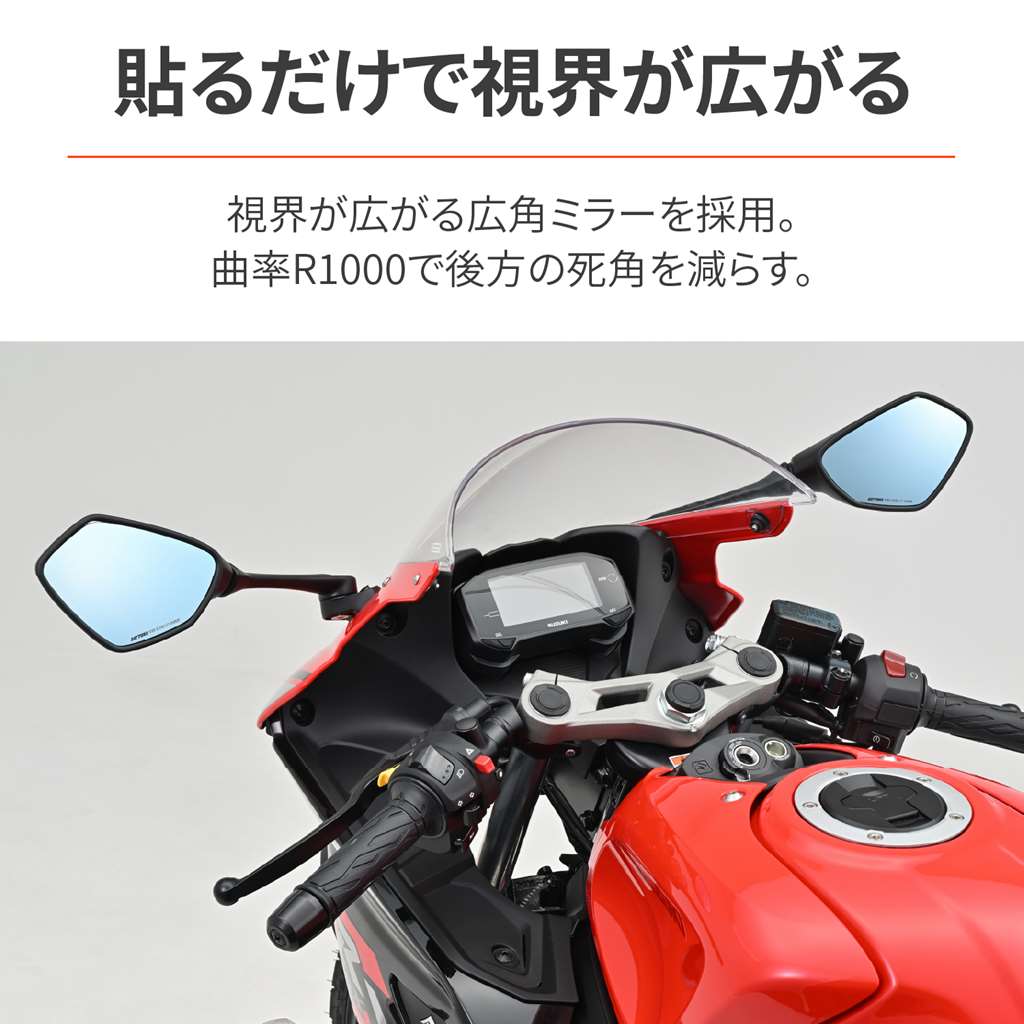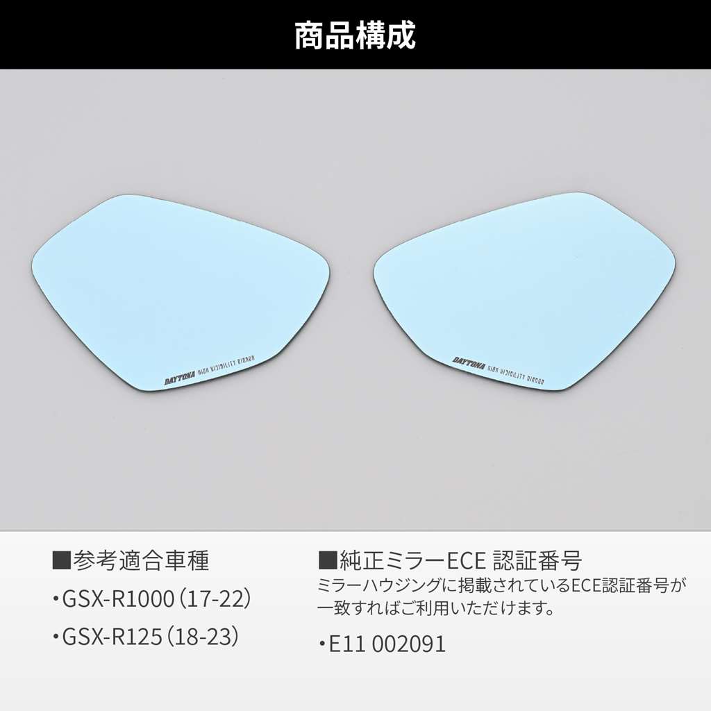 貼るだけで視界が広く、見やすいハイビジミラー。純正よりも視界が広がる曲率R1000の広角ミラーで後方の死角を減らします。防眩効果のあるブルーミラーを採用し、ヘッドライトによる眩しさを軽減。純正ミラーに貼り付けるだけなので、ノーマルのスタイルを崩さずに視界を確保します。【純正ミラーECE 認証番号】E11 002091ミラーハウジングに掲載されているECE 認証番号が一致すれば、参考適合車種以外の車両にも取付が可能です。参考適合車種:GSX-R1000(2017-2022年)、GSX-R125(2018-2023年)純正ミラーに貼り付けるだけで視界が広がる曲率R1000の広角ミラー防眩効果のあるブルーミラーを採用し、ヘッドライトによる眩しさを軽減純正ミラーECE 認証番号:E11 002091 に適合新保安基準適合※本商品は強力な接着力で張り付いているので、剥がすことはできません。無理に剥がすと本商品および、純正ミラー側も割れてしまう可能性がありますのでご注意ください。※本商品はガラス製品のためケガ、割れなどお取り扱いには充分ご注意ください。※気温の低いときの施工は両面テープの接着力が低下しますので、ドライヤーなどで軽く暖めて作業することをおすすめします。※テープの完全接着までは(約24時間程度かかります)水濡れや激しい振動を与えないようにしてください。※車体側ミラーの製造誤差により、本商品との形状にズレが生じることがあります。ズレが生じた場合黒色油性マジックで車体側ミラー枠に沿って塗るとすき間が目立たなくなります。※本商品が車体側にはまらない場合は、車体側ミラーの縁をドライヤーなどで暖めるとはまりやすくなります。※強力両面テープを使用しておりますので、貼り直しはできません。位置決めなど慎重に行なうようにしてください。無理に剥がそうとした際は、ミラーの破損、ケガの恐れがあります。絶対に行なわないでください。※本商品は、ワイドミラータイプとなっております。遠近感が純正ミラーと異なります。慣れるまで慎重に運転するように心がけてください。※ミラーの縁は滑らかになっておりますが手を切ったりしないよう充分ご注意ください。※ミラー用のケミカル類は使用しないでください。