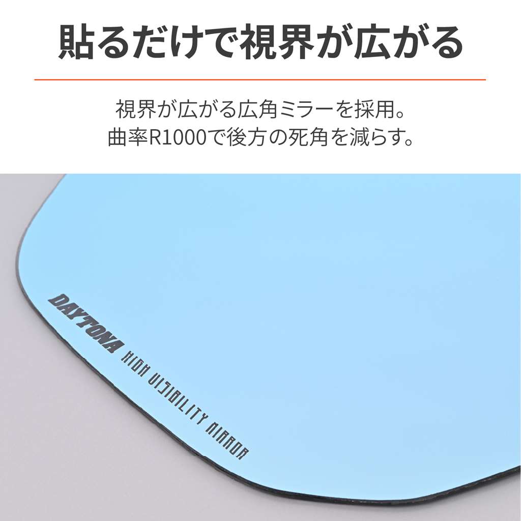 貼るだけで視界が広く、見やすいハイビジミラー。純正よりも視界が広がる曲率R1000の広角ミラーで後方の死角を減らします。防眩効果のあるブルーミラーを採用し、ヘッドライトによる眩しさを軽減。純正ミラーに貼り付けるだけなので、ノーマルのスタイルを崩さずに視界を確保します。【純正ミラーECE 認証番号】E13 005036ミラーハウジングに掲載されているECE 認証番号が一致すれば、参考適合車種以外の車両にも取付が可能です。参考適合車種:Ninja H2 SX/SE(2018-2019年)、Ninja ZX-10R/R SE/RR(2011-2024年)純正ミラーに貼り付けるだけで視界が広がる曲率R1000の広角ミラー防眩効果のあるブルーミラーを採用し、ヘッドライトによる眩しさを軽減純正ミラーECE 認証番号:E13 005036 に適合新保安基準適合※本商品は強力な接着力で張り付いているので、剥がすことはできません。無理に剥がすと本商品および、純正ミラー側も割れてしまう可能性がありますのでご注意ください。※本商品はガラス製品のためケガ、割れなどお取り扱いには充分ご注意ください。※気温の低いときの施工は両面テープの接着力が低下しますので、ドライヤーなどで軽く暖めて作業することをおすすめします。※テープの完全接着までは(約24時間程度かかります)水濡れや激しい振動を与えないようにしてください。※車体側ミラーの製造誤差により、本商品との形状にズレが生じることがあります。ズレが生じた場合黒色油性マジックで車体側ミラー枠に沿って塗るとすき間が目立たなくなります。※本商品が車体側にはまらない場合は、車体側ミラーの縁をドライヤーなどで暖めるとはまりやすくなります。※強力両面テープを使用しておりますので、貼り直しはできません。位置決めなど慎重に行なうようにしてください。無理に剥がそうとした際は、ミラーの破損、ケガの恐れがあります。絶対に行なわないでください。※本商品は、ワイドミラータイプとなっております。遠近感が純正ミラーと異なります。慣れるまで慎重に運転するように心がけてください。※ミラーの縁は滑らかになっておりますが手を切ったりしないよう充分ご注意ください。※ミラー用のケミカル類は使用しないでください。