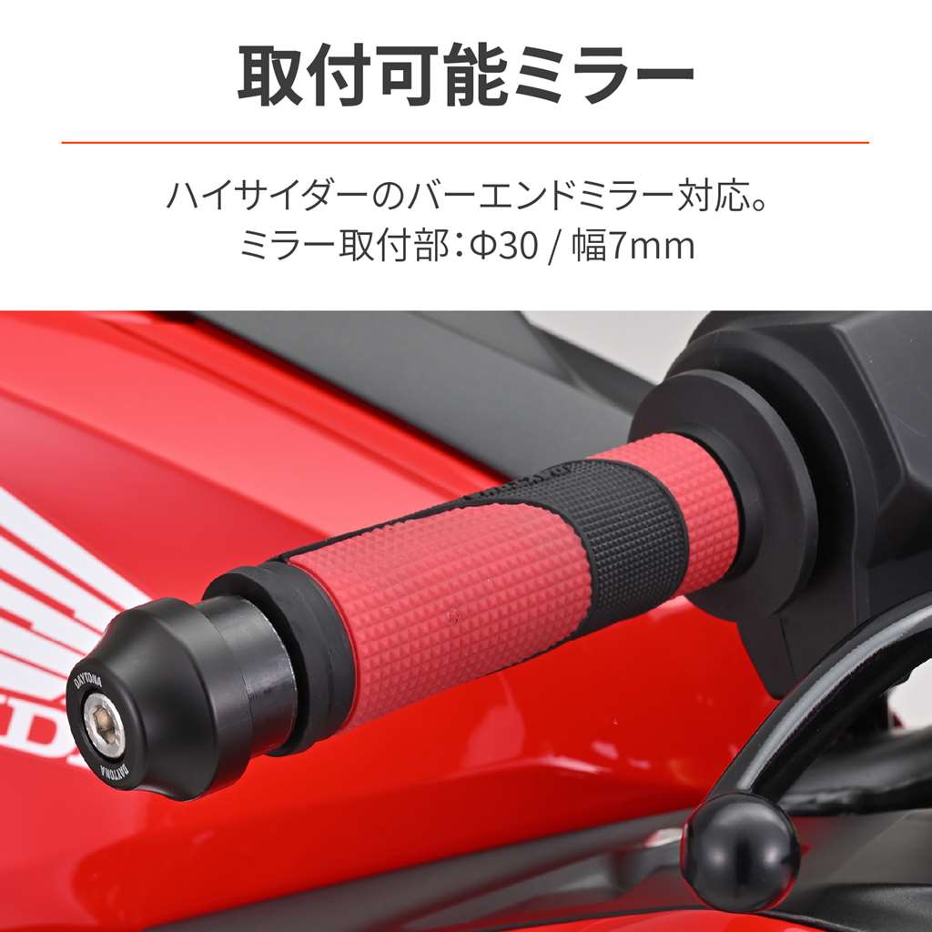 振動軽減ウエイトを内蔵したバーエンドミラーアダプター。ハンドルの振動を軽減するヘビーウエイトタイプのバーエンドです。バーエンドミラーの装着が可能で、ハイサイダーのバーエンドミラーに対応。防振効果によりブレが減少し、ミラーが見やすくなります。スロットルに干渉しにくい構造で様々な車種に取付可能。【適合サイズ】ホンダ(半月形状のインナーウエイト装着車) ハンドル内径φ17-19用【重量】片側 約250g・ミラー取付部:φ30、幅7mm・左右2個セット ・スチール製マットブラック塗装仕上げ ・ステンレス製ボルト採用振動軽減ウエイトを内蔵したバーエンドミラーアダプターホンダ(半月形状のインナーウエイト装着車) / ハンドル内径:φ17-19用ハンドルの振動を軽減して走行中の疲労軽減防振効果によりミラーのブレを抑え、視認性を向上ミラー取付部:φ30 / 幅7mm※レバー操作時にバーエンドミラーのアームが接触する場合はレバーホルダーの位置調整が必要です。※ハンドル幅が変更されるため車検証の記載変更が必要となる場合があります。※純正インナーウエイトがある車両は取り外しが必要です。※内径にパイプ接合部の突起がある場合は削り取る必要があります。※純正グリップヒーター装着モデルは取外し工程でグリップヒーターが破損する場合があります。