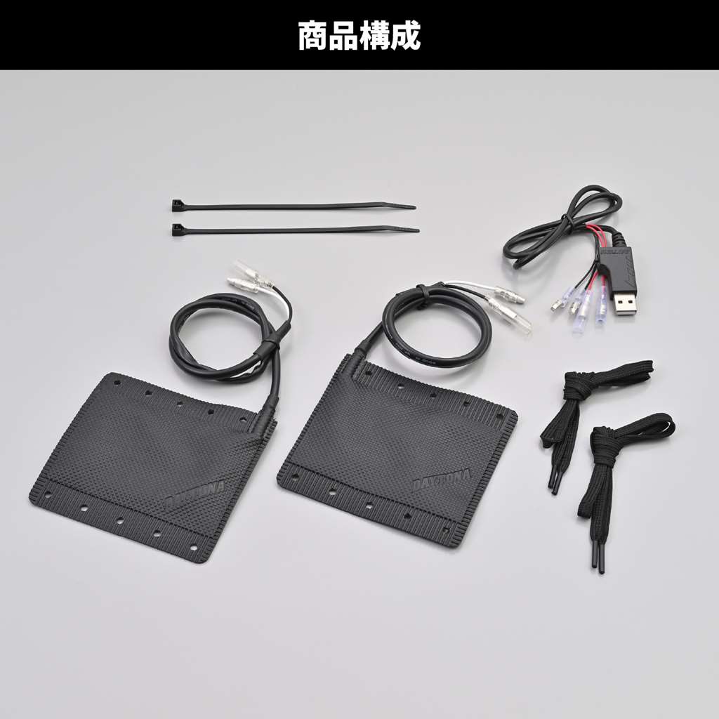 グリップ交換なし。脱着が簡単な巻き付け式ホットグリップ。専用グリップへの交換不要、USB接続で配線加工も不要。モバイルバッテリーでも使用可能。省電力設計の11W。薄く断線しにくいフィルムヒーター採用。ON/OFFスイッチは、目立ちにくいUSB端子一体式です。表面はデイトナロゴ入りで滑りにくいデザイン。・対応ハンドル径:φ22.2 / 取付グリップ全長:110mm以上・ヒートシート:95×105mmグリップ交換不要、USB接続で配線加工も不要。取り付け簡単な巻き付け式ホットグリップモバイルバッテリーでも使用可能な省電力設計の11W薄く断線しにくいフィルムヒーター採用対応ハンドル径:φ22.2 / 取付グリップ全長:110mm以上ヒートシート:95×105mm※本商品は5V2.1A以上の出力のUSBポート(別売り)への使用を前提に設計しています。ポート側が5V2.1Aを安定して出力できない場合は発熱量が不足します。USB2ポート(2口合計2.1A出力)へ他機器と同時に使用する際などは特にご注意ください。※厚手の冬用グローブを必ず使用してください。薄手のグローブを使用した場合はやけどまたは低温やけどを起こしやすくなり危険です。※長時間の連続使用は避けてください。※モバイルバッテリーでの使用時間の目安:6000mA/hで1〜1.5h(使用環境やバッテリーの劣化状態で増減します)※ご使用のグリップ径によっては取り付けができない場合があります。