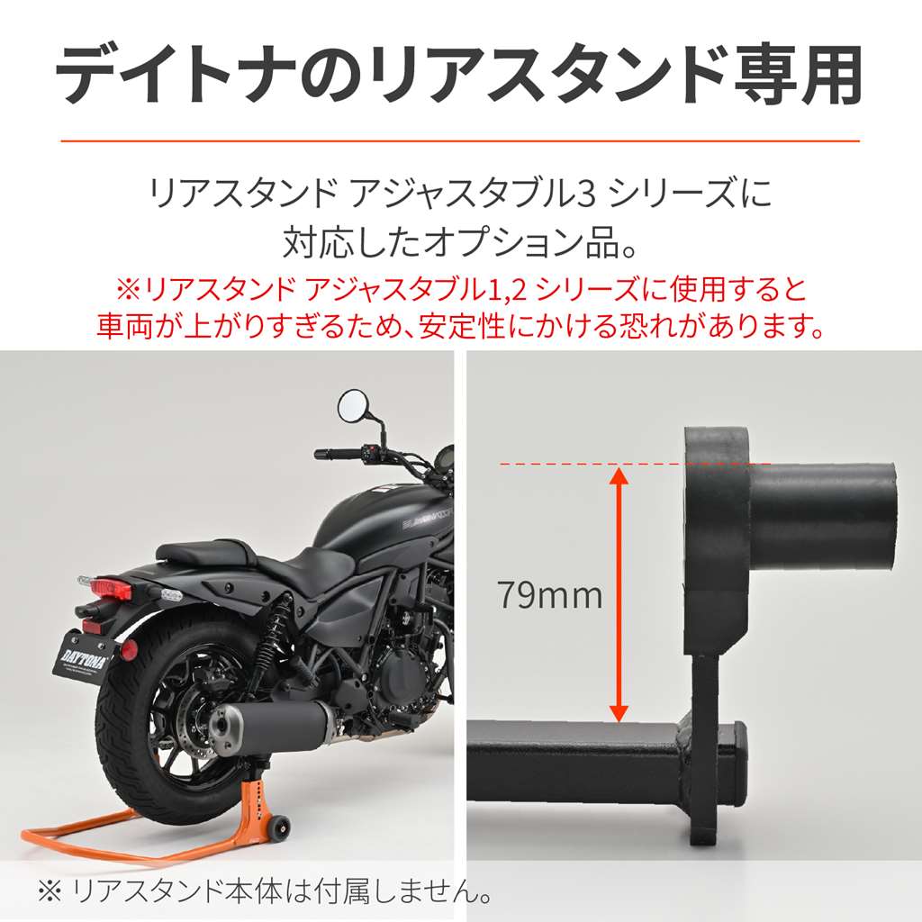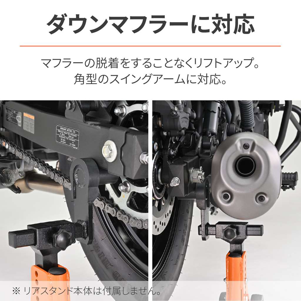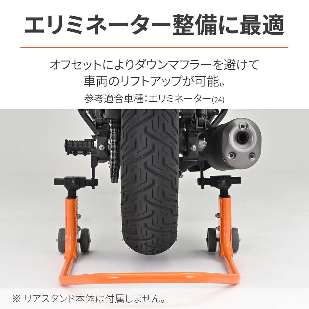 リアスタンドアジャスタブル3シリーズ専用のオプション品。角型スイングアームのダウンマフラーの車両に最適です。オフセットアタッチメントによりエリミネーターなどのマフラーが干渉してしまう車両でも、マフラーの脱着をせずにリフトアップが可能になります。リアスタンドアジャスタブル3シリーズ専用のアタッチメントダウンマフラーを避けてリフトアップが可能エリミネーターなどの角型スイングアームに最適オフセットアタッチメントによりマフラーの脱着なしでリフトアップ※リアスタンドアジャスタブル1・2に使用すると、一番低くても車両が上がりすぎるため、安定性に欠ける恐れがあります。