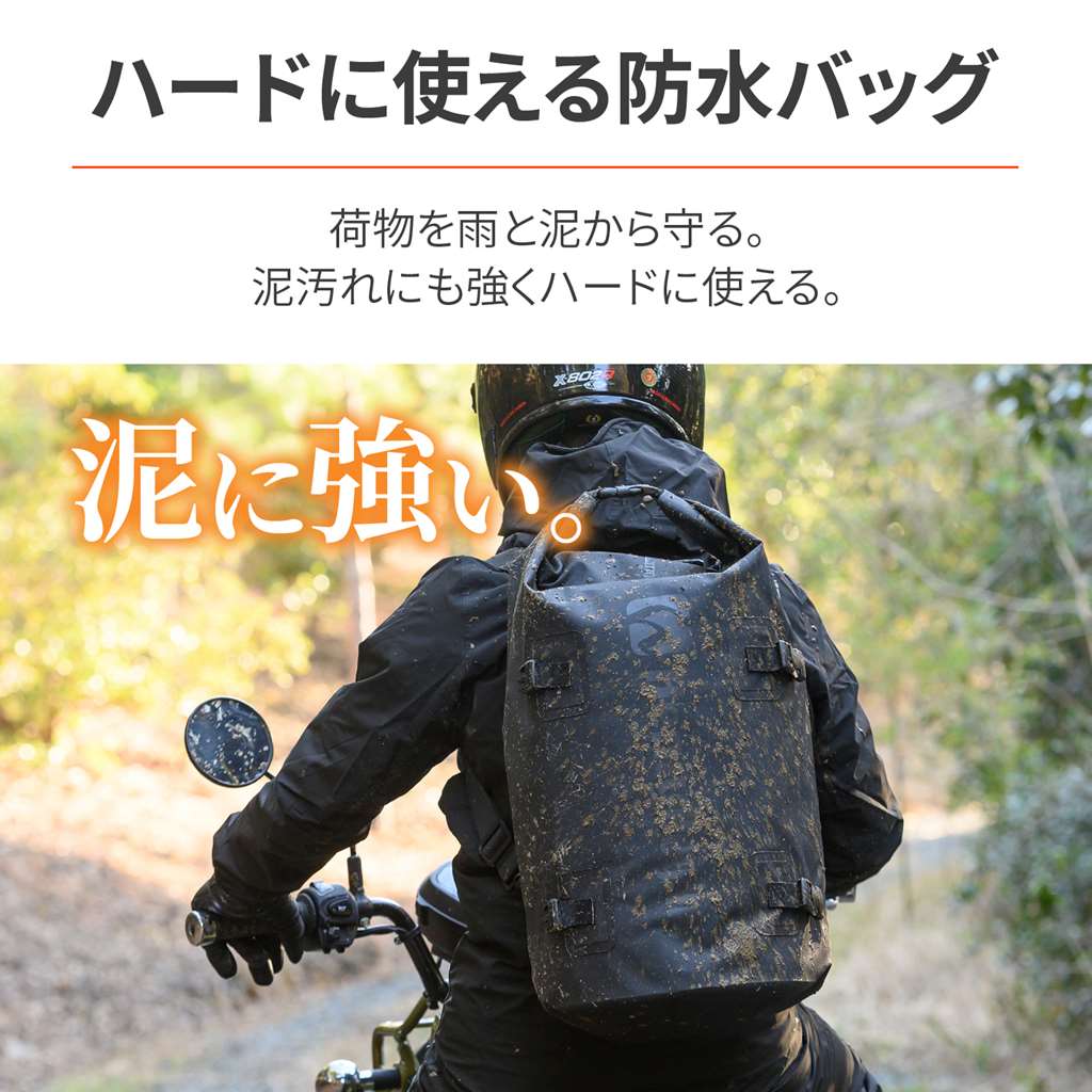 雨、泥を気にせずアクティブにバイクに乗りたい、そんなライダーのための防水バックパック。ターポリン生地と縫い目のないシームレスで高い防水性を実現し、水だけでなく泥跳ねからも荷物を守ります。水が浸入しないように出し入れ口はロールトップを採用。付属の固定ベルトを使うことで、シートバッグとしての使用が可能。防水シートバッグ(DH-749、DH-767シリーズ)と連結が可能で、更に用途が広がります。容量:30Lサイズ:Φ300×高さ450mm本体重量(付属品込):750g最大積載量:7kg素材:ターポリン生地付属品:固定ベルト×4、ショルダーベルト×2高い防水性のある生地とシームレス加工により、水だけでなく泥跳ねからも荷物を守る防水バックパック容量:30L / サイズ:Φ300×高さ450mm / 本体重量(付属品込):750g付属の固定ベルトでシートバッグとして利用可能防水シートバッグ(DH-749、DH-767シリーズ)と連結が可能付属品:固定ベルト×4、ショルダーベルト×2