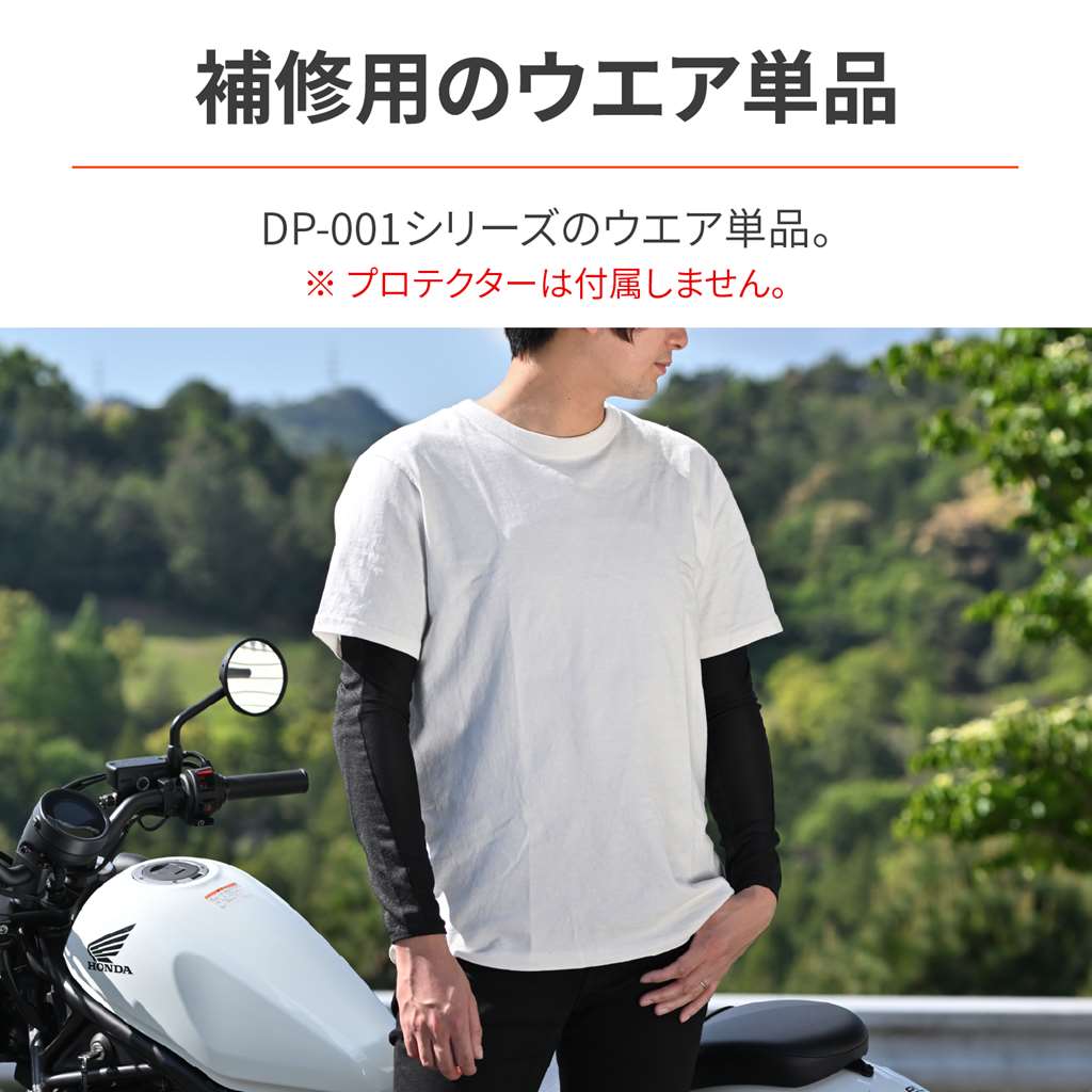 インナープロテクター DP-001シリーズの補修ウエア。ウエア補修用、洗濯時の替え用の一着としてご使用ください。サイズが合えばお手持ちのプロテクターを挿入してインナーとして着用いただけます。シルエットはタイト目なスリムフィット形状。通気性と速乾性に優れるメッシュ生地と耐摩耗性、耐引裂性に優れる「HPPEマテリアル」を組み合わせたインナーウエア。【HPPEマテリアル】耐切創繊維(切れにくい機能性繊維)として、機械的防護手袋の要求性能試験「EN 388:2016」の回転刃試験にてレベル4を取得した生地と同等の生地を採用。【適合ウエア】耐切創スリムフィットインナープロテクター DP-001シリーズ名:DP-001 補修ウエア耐切創+ストレッチ+メッシュタイプウエア補修用、着替え用の一着に※プロテクターは付属しません。※本製品はモーターサイクルライディングウェアとしての快適性および安全性を重視して開発されておりますが、転倒時など外部からの衝撃に対して、身体を完全に保護できるものではありません。ライディング時は常に安全運転をお願いいたします。※ご自身の体にフィットするものをお選びください。サイズが合っていないウェアを着用されますと、プロテクション効果が充分に発揮されない場合やライディングに支障をきたす場合もあり非常に危険です。