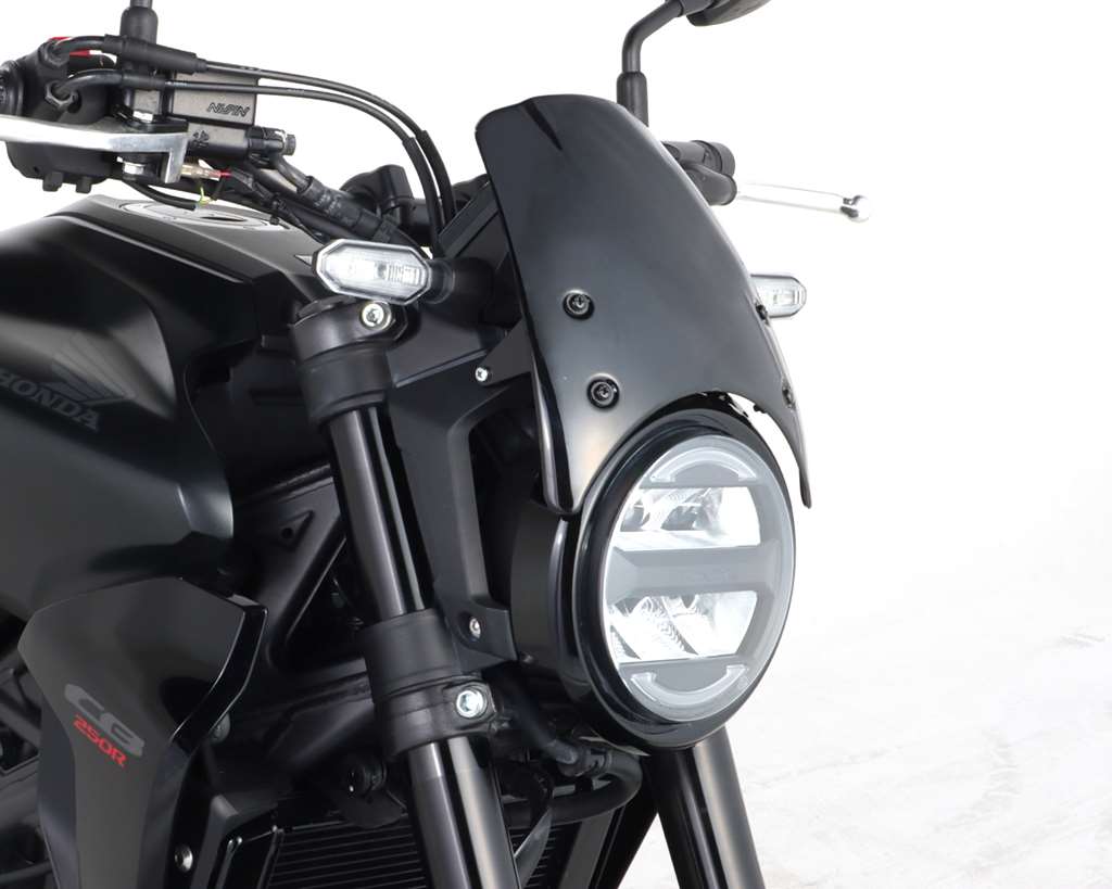 フロント周りを引き締めるポリカーボネイト製の小型バイザー。汎用のダークスモークタイプスクリーンを採用。