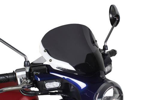 風防効果を発揮し、走行時の空気抵抗によるライダーの疲労を軽減する“メーターバイザー”ヘッドライトの上部にバイザーを固定することで、風防効果を発揮することが出来ます。これにより、走行時の空気抵抗によるライダーの疲労を軽減出来ます。純正部品のようなフィッティングの為、スーパーカブC125の流麗なスタイリングを崩すことなく、取付けることが出来ます。又、ノーマルフロントカウルに合わせたバイザーのカットラインと曲面がドレスアップ効果を高め、車両を美しく演出します。バイザーは高品質なポリカーボネイト製で、精悍な雰囲気が際立つスモーク仕様を採用。固定用ステーはスチール製ブラック塗装仕上げ注意事項固定用ステー取付けの際、バックミラーベース部のラバー切断加工が必要になります。