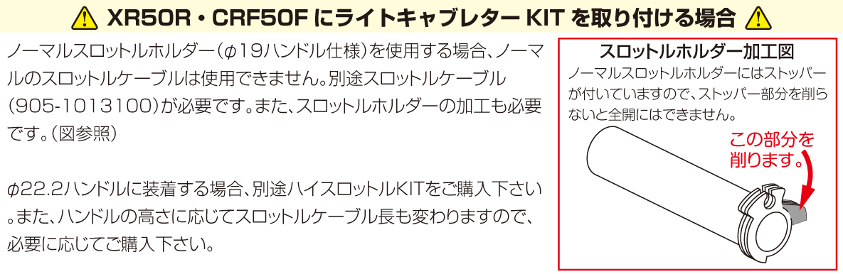左出しタイプインテークポート径φ16対応M/J#85 P/J#35 組込済※ノーマルエアクリーナー使用不可※1:ダックス50に装着する場合、別途当社製フュエルコックタイプ1が必要です。※2:CD50・ベンリィに装着する場合、別途当社製スロットルケーブル(905-1013100もしくは905-1086100)が必要です。※3:XR50R/CRF50Fに装着する場合、スロットルホルダーの加工と別途当社製スロットルケーブル(905-1013100)が必要です。