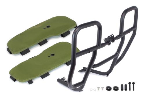 Φ25.4スチール製パイプを採用した強固なサイドバンパーです。本製品を装着することで、立ちごけ等の軽度な転倒に対し、エンジンやチェンジペダルへのダメージを軽減します。又、付属のレッグシールドをサイドバンパーに装着することで、風防効果を得ることができます。これにより、ライダーの疲労を軽減すると共に走行中、フロントタイヤが巻き上げる水や泥などから自身を守ることが出来ます。レッグシールド(左右)の装着は、裏面にあるベルクロをパイプに巻きつけ、中央にあるボスにスチール製ボルトとアルミ削り出しリテーナーでしっかりと固定します。この固定部分のボスには、フォグランプキット(別売)を装着することができます。更にサイドバンパー本体のストレート部分には、アクションカメラやペットボトルホルダー(別売)なども装着できます。サイドバンパー本体:スチール製パイプブラック塗装仕上げ。レッグシールド:強化ナイロン製純正アンダーガードをそのまま使用します。 注意事項シールドの生地自体には、防水加工は施しておりません。使用する場合は必ず防水スプレーにて防水加工を行い装着してください。ヘッドライトステー装着用フォグランプキットとは干渉する為、同時装着は出来ません。