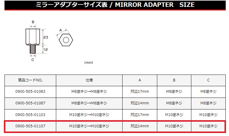 ミラーアダプター 対辺14mm・逆ネジM10→逆ネジM10タイプ KITACO(キタコ)
