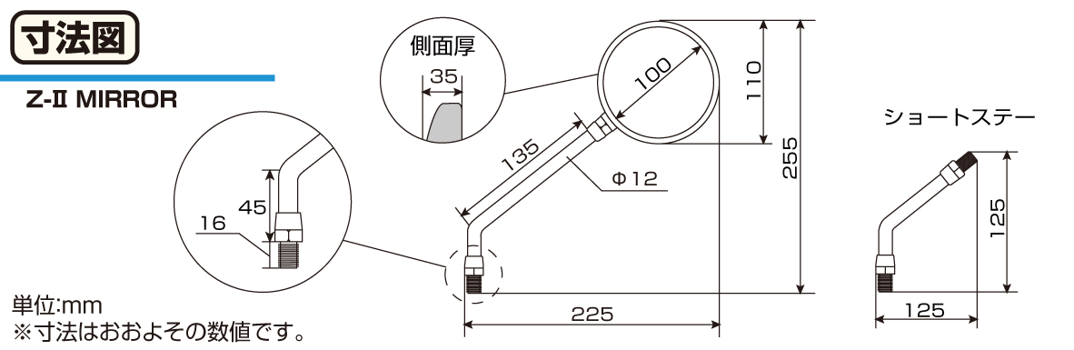シンプルな丸型ミラー。Z-2のスタイリングを模したデザインは様々なバイクにマッチします。※現行の当社製ミラーは全て平面鏡を使用しています。左右共通1本販売ショートステー付属取付部ボルト径:10mmミラーサイズ:φ1102007年保安基準適合