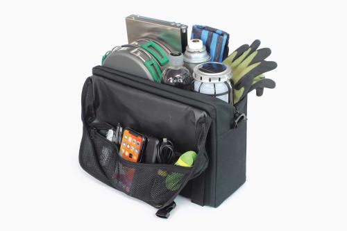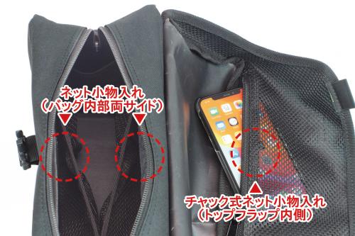 バッグのメインホールには、260mm×350mm×120mm(約11L)を採用。更にバッグにはネット小物入れをメインホールにに2ヶ所、トップフラップ内側に1ヶ所(チャック付き)装備しています。