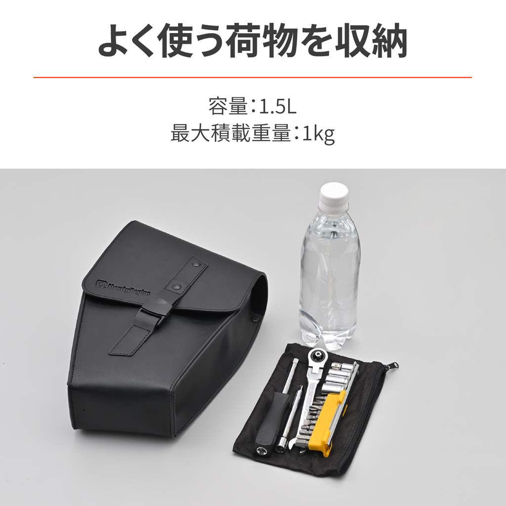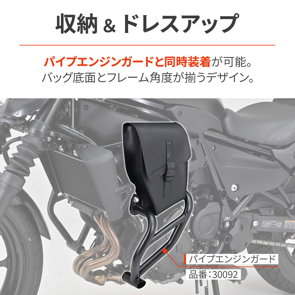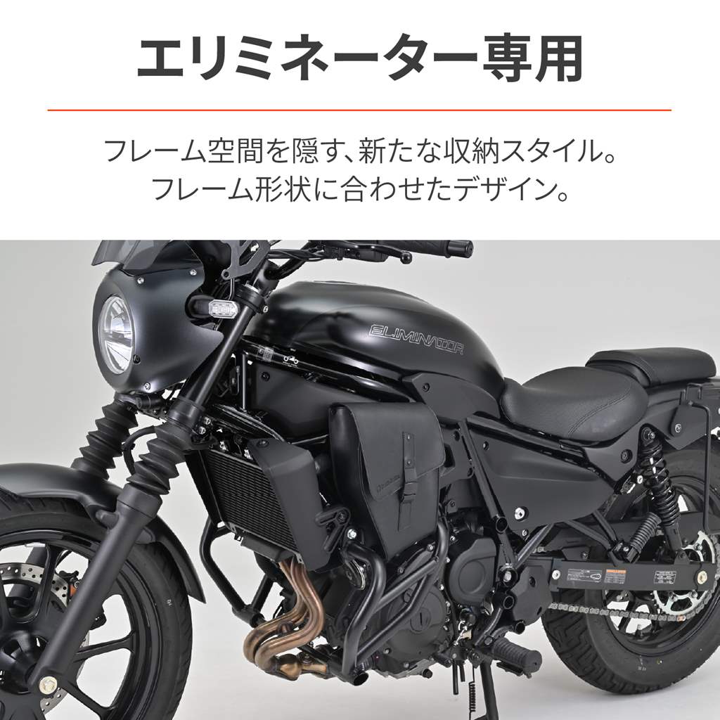 エリミネーター/SE(24)専用のフレームバッグ。左側用。フレーム空間を隠す、新たな収納スタイル。フレームにベルトで固定するだけなので取り付けが簡単。車種専用設計なので車体のイメージを崩さず、ボリューム感が出るのでドレスアップにも一役買います。マグネット式バックルによりグローブをつけたまま片手で簡単に開閉可能。財布や車載工具などの収納に便利です。デイトナ製パイプエンジンガード(品番:30092)との同時装着可能。組み合わせ装着した時のバランスにも配慮しました。・バッグ容量:1.5L・最大積載重量:1kg適合車種:エリミネーター/SE(24) 左側専用フレームにベルトで固定するだけの簡単取り付け車種専用設計で車体のイメージを崩さないまま、ボリューム感を出しドレスアップマグネット式バックルによりグローブをつけたままで簡単に開閉バッグ容量:1.5L / 最大積載重量:1kg