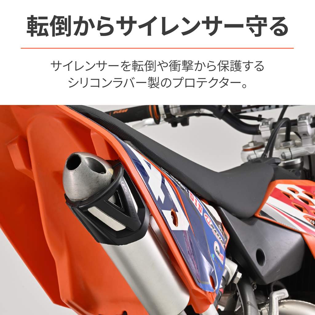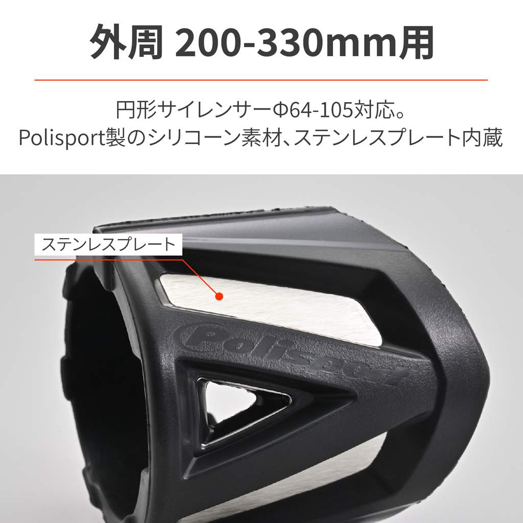 サイレンサーを転倒や衝撃から保護するシリコンラバー製のプロテクター。伸縮性があるためオーバル断面のサイレンサーにも使用可能。取り付けには工具不要で、サイレンサーに引き伸ばし装着するだけで簡単です。【適合サイズ】マフラー外周長:200ー330mm円形サイレンサー:φ64-105対応・シリコーン製、ステンレスプレート内蔵・Polisport製転倒や衝撃からサイレンサーを守るシリコンラバー製のプロテクターマフラー外周長:200ー330mm 円形サイレンサー:φ64-105に対応サイレンサーに引き伸ばし装着で簡単Polisport製※マフラー熱によりプロテクターの跡が残ることがあります。※転倒などによる商品や車体の破損は補償対象外です。