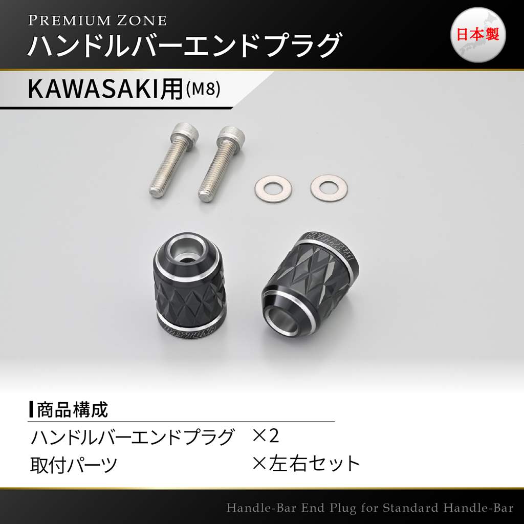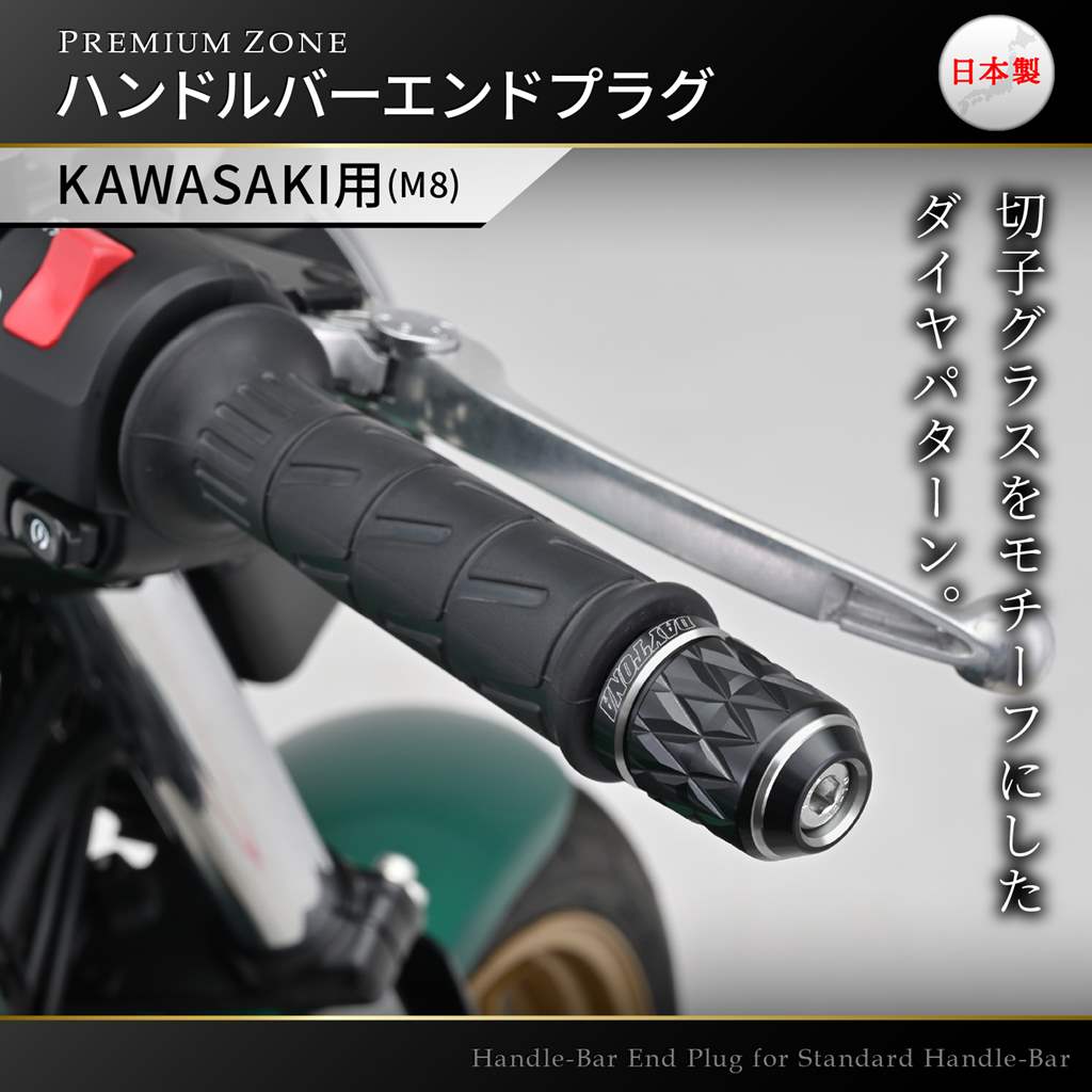 「創」と「麗」を極めた逸品PREMIUM ZONEシリーズのバーエンド。アルミの無垢素材から繊細で丁寧な加工で削り出し、2色の色彩がきわだつ優美なデュアルアルマイト仕上げ。こだわりの日本製。カスタムの定番でもあるダイヤ形状を、工芸品「江戸切子」をモチーフに表現したKIRIKO。M8ボルトで固定されているKAWASAKI車の純正ハンドルに対応。【デイトナ社確認車両】1400GTR(08-16)、ZZR1400(06-11)、Ninja ZX-14R/ABS(12-20)、ZRX1200DAEG(09-16)、ZRX1200R(01-08)、ZRX1200S(01-04)、ZZR1200(02-05)、ゼファー1100/RS(92-06)、ZZ-R1100(99-01)、ZRX1100(97-00)、ZRX1100 2(97-00)、Ninja1000(11-19)、Z1000/ABS/R EDITION(03-22)、Ninja ZX-10R(11-15)、Z900(18-22)、Z900RS/CAFE(18-23)、GPZ900R(91-03)、Z800(13-16)、Z750/S(04-10)、Z650RS(22)、ER-6n(06-14)、Ninja ZX-6R(19-22)、エリミネーター/SE(24)、Ninja400(14-22)、Ninja ZX-4R/R/SE(24)、Ninja400R(11-13)、ZZR400(90-06)、Ninja250(13-22)、Ninja250R(08-12)、Ninja ZX-25R/SE/SE KRT Edition(21-22)、Z250(13-17)M8ボルトで固定されているKAWASAKI車の純正ハンドルに対応アルミ削り出しで2色のコントラストが際立つデュアルアルマイト仕上げ日本製参考適合車種:ZRX1200DAEG(09-16)、Z900RS/CAFE(18-23)、エリミネーター/SE(24)、Ninja ZX-4R(24)、Ninja ZX-25R(21-22)など※本体はアルミ製です。メーカー別ハンドルに対応したアタッチメントはスチール製黒塗装仕上げです。※ハンドル最大幅が変更となります。車種によっては記載変更が必要です。※スロットルに接触する場合は、M8ワッシャをすきまに入れて調整してください。