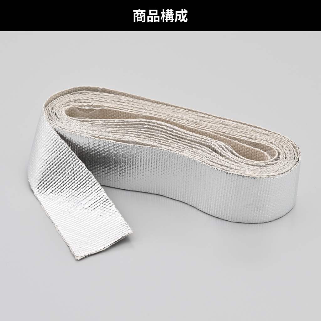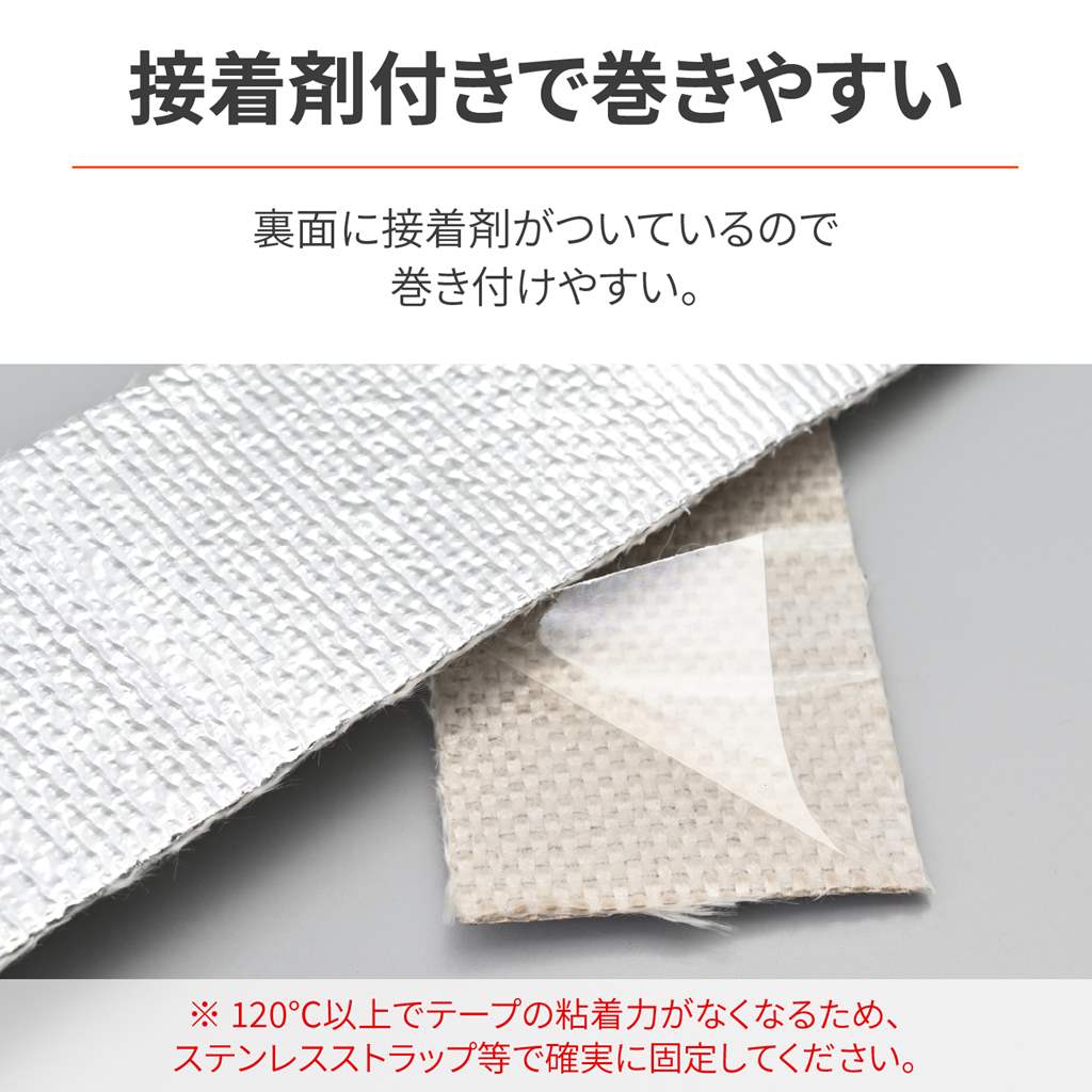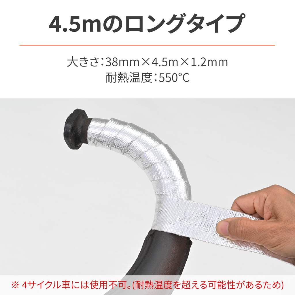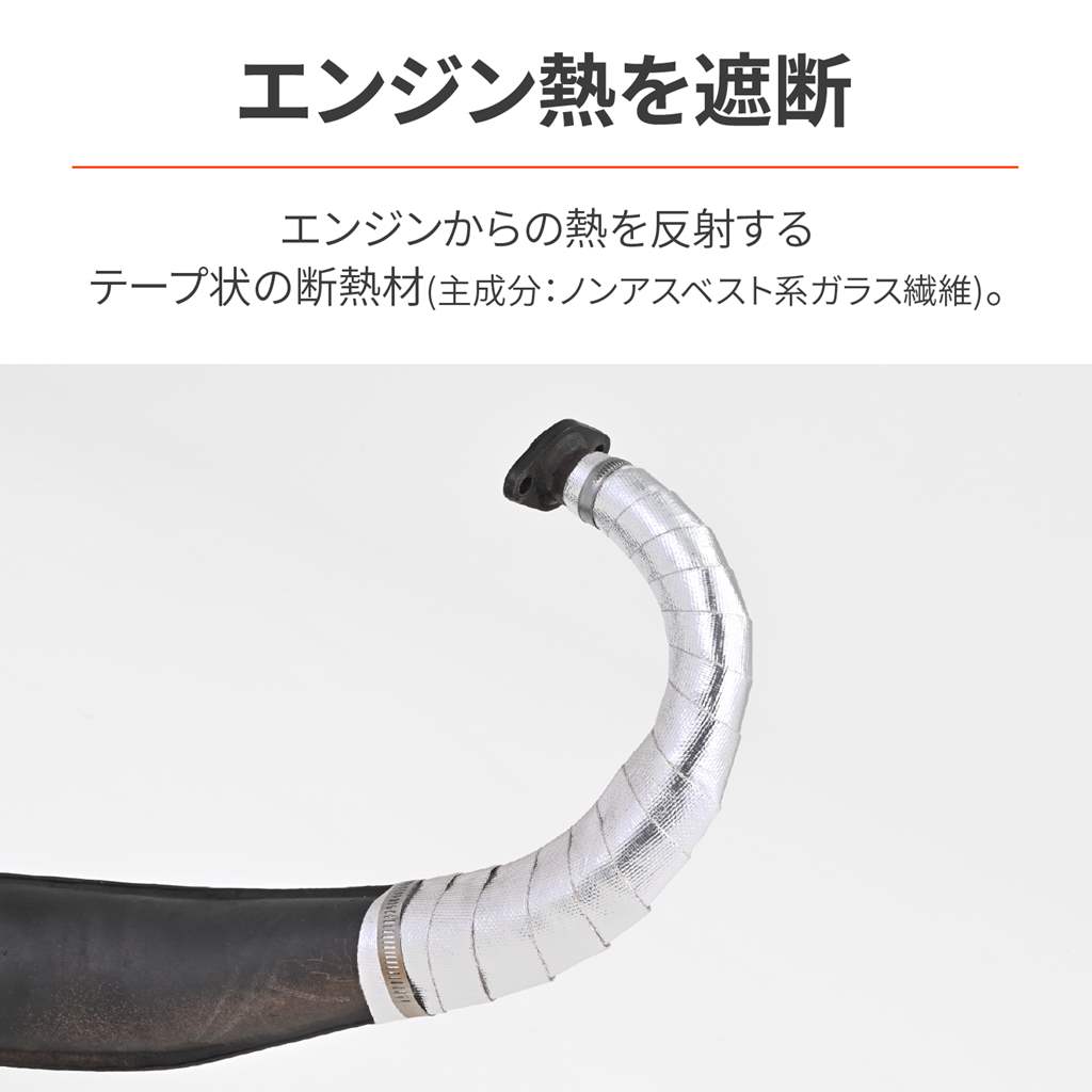 エンジンからの熱を反射して遮断するテープ状の断熱材(主成分:ノンアスベスト系ガラス繊維)です。全長4.5mで好みの長さでカット可能。裏面に接着剤が付いているので巻き付けやすくなっています。サイズ:幅38mm×長さ4.5m×厚み1.2mm耐熱温度:550℃ 表面:アルミ製裏面:粘着タイプエンジンからの熱を遮断するテープ状の断熱材好みの長さにカット可能テープ裏面に接着剤付きで巻き付けやすいサイズ:幅38mm×長さ4.5m×厚み1.2mm耐熱温度:550℃ ※120℃以上でテープの粘着力が無くなるため、ステンレスストラップ等で確実に固定してください。※4サイクル車には使用不可(耐熱温度を超える可能性があるため)