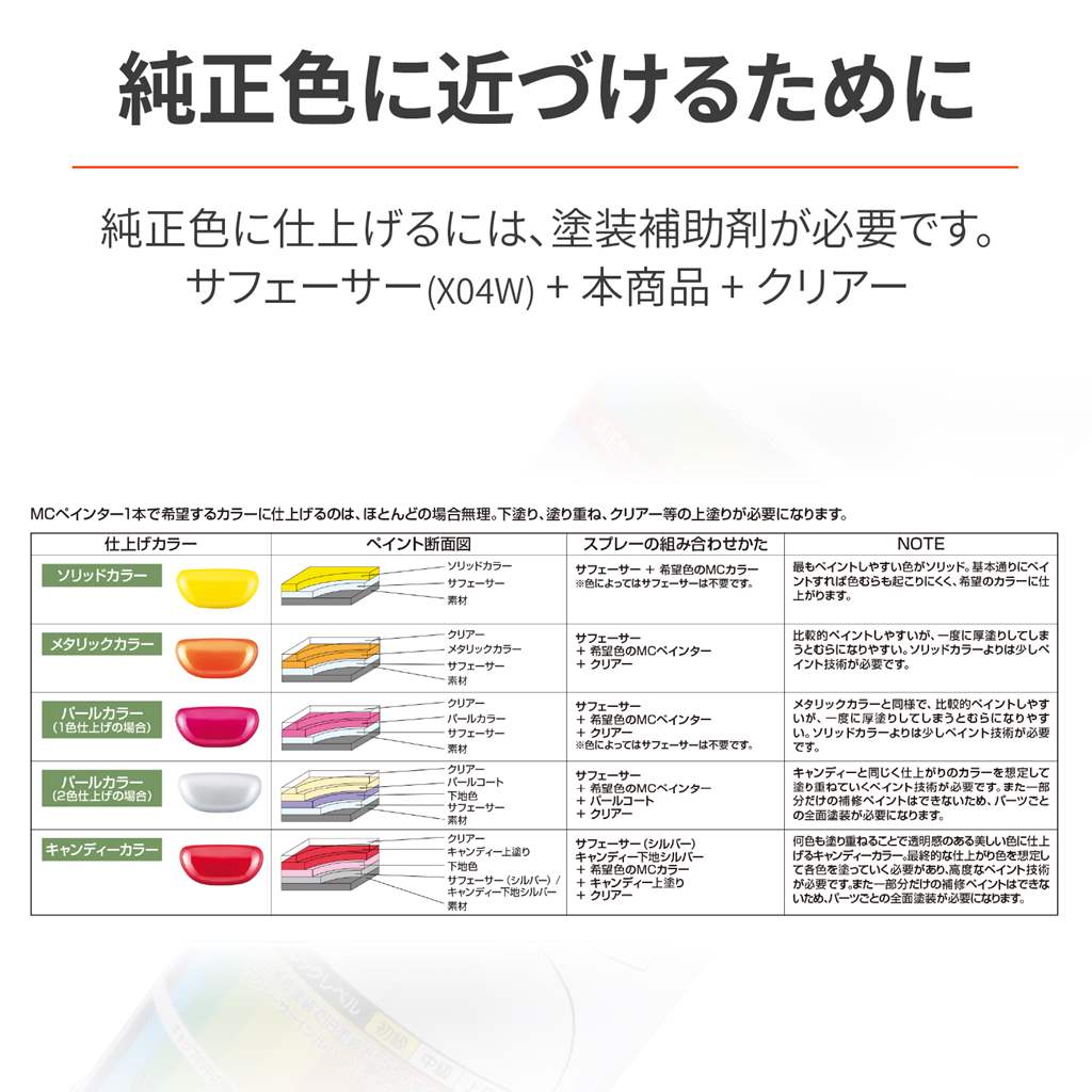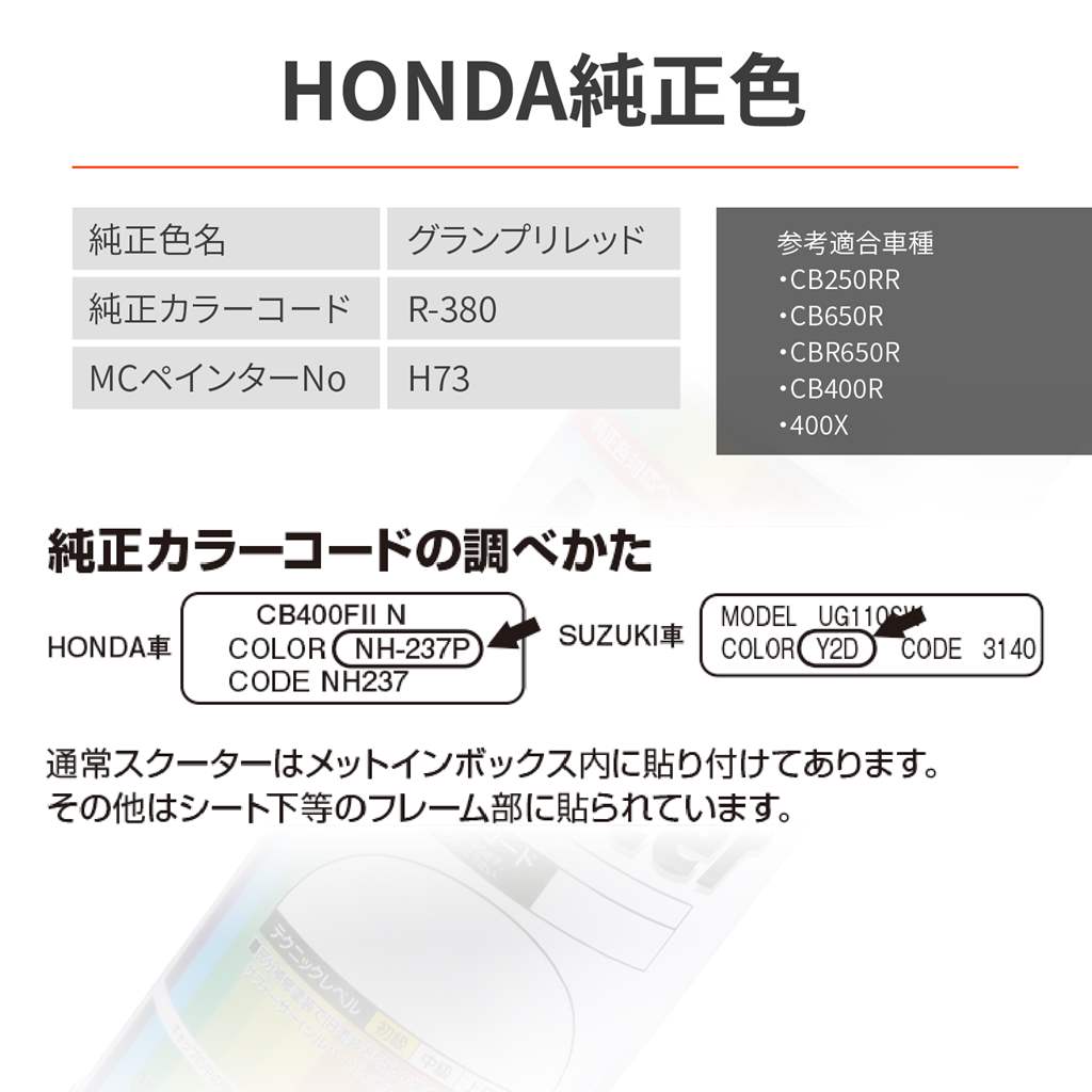 MCペインターは各メーカーの純正色に対応したペイントスプレー。部分補修時のペイントや、全体に色あせてしまった時の新車カラーの再現、または好みの他社カラーへのオールペイント等、様々に利用できます。純正同様、複数の色を重ね塗りすることで、バイクの車体色をリアルに再現できます。本品のほかに下地塗料と仕上げ用クリアー塗装をご利用ください。【純正カラーコード】R-380【参考適合車両】CB250RR、CB400R、400X、CBR650R、CB650R容量:300ml 成分:合成樹脂(アクリル)、ニトロセルロース、顔料、有機溶剤下地塗料:X04W(品番:68660)仕上げ塗料:耐ガソリンペイントクリアー(品番:72709)【純正カラーコード】R-380【参考適合車種】CB250RR、CB400R、400X、CBR650R、CB650R純正同様、複数の色を重ね塗りすることでバイクの車体色をリアルに再現本品のほかにクリアー塗装が必要容量300ml※仕上がり参考色は印刷のため実際の塗料とは異なります。ご購入前に店頭のMCペインター色見本帳をご参照のうえお買い求めください。※色の組合せにクリアーの指示が無いものでも耐ガソリンペイントクリアー(品番:72710)で仕上げることをおすすめします。(特にガソリンタンク)※本製品は純正カウルより調色し、できる限り近似色にて製作しています。塗り方や純正カウルの劣化状況により、色味が異なって見えることがあります。