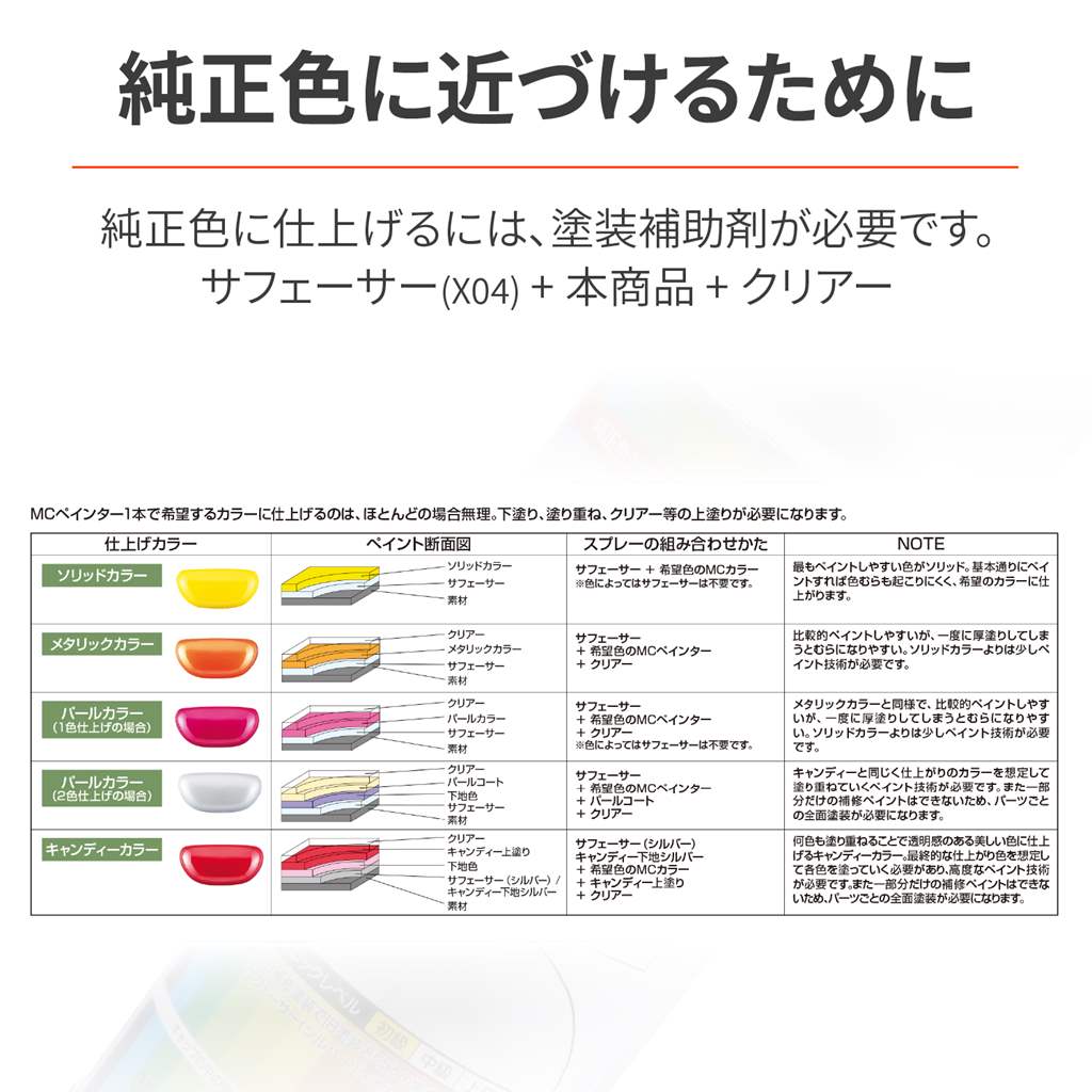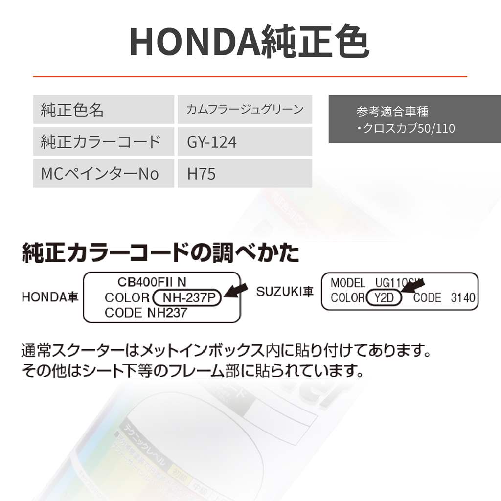 MCペインターは各メーカーの純正色に対応したペイントスプレー。部分補修時のペイントや、全体に色あせてしまった時の新車カラーの再現、または好みの他社カラーへのオールペイント等、様々に利用できます。純正同様、複数の色を重ね塗りすることで、バイクの車体色をリアルに再現できます。本品のほかに下地塗料と仕上げ用クリアー塗装をご利用ください。【純正カラーコード】GY-124【参考適合車両】クロスカブ110、クロスカブ50容量:300ml 成分:合成樹脂(アクリル)、ニトロセルロース、顔料、有機溶剤下地塗料:X04(品番:68658)仕上げ塗料:耐ガソリンペイントクリアー(品番:72709)【純正カラーコード】GY-124【参考適合車種】クロスカブ110/50純正同様、複数の色を重ね塗りすることでバイクの車体色をリアルに再現本品のほかにクリアー塗装が必要容量300ml※仕上がり参考色は印刷のため実際の塗料とは異なります。ご購入前に店頭のMCペインター色見本帳をご参照のうえお買い求めください。※色の組合せにクリアーの指示が無いものでも耐ガソリンペイントクリアー(品番:72710)で仕上げることをおすすめします。(特にガソリンタンク)※本製品は純正カウルより調色し、できる限り近似色にて製作しています。塗り方や純正カウルの劣化状況により、色味が異なって見えることがあります。