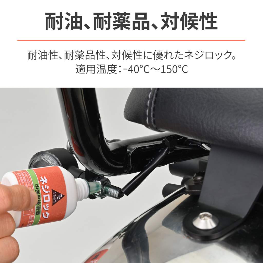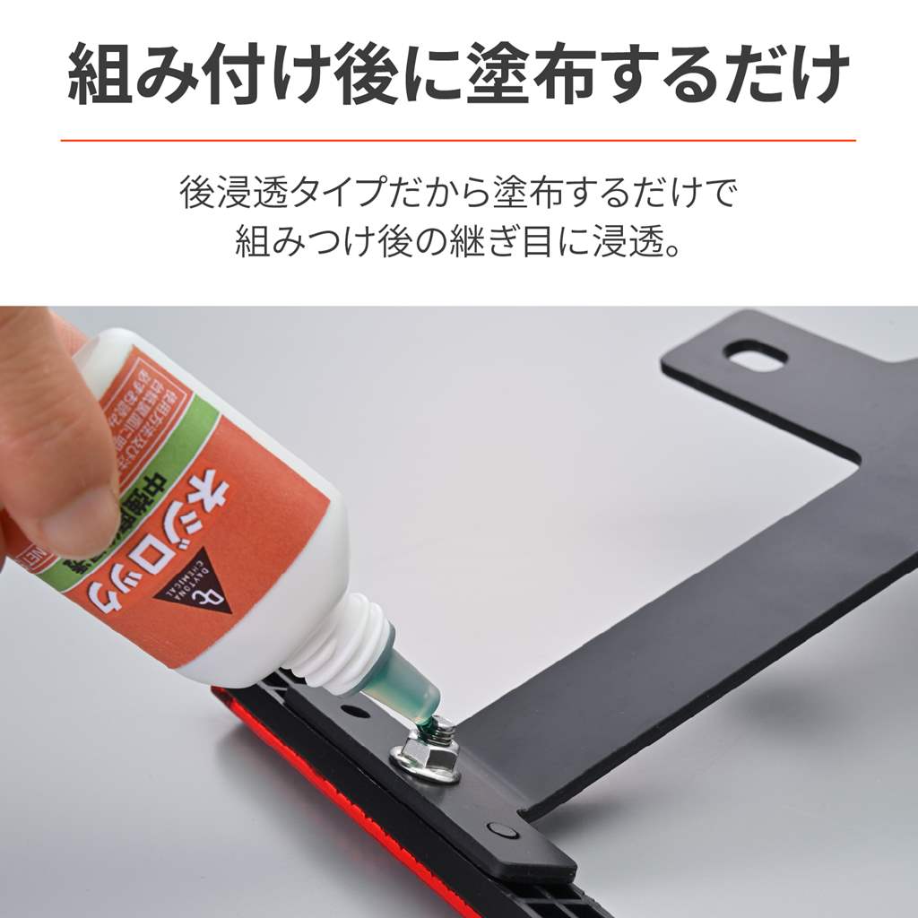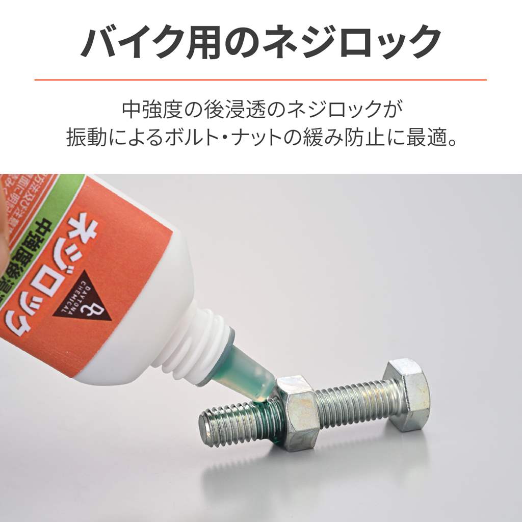 組み付け後、継ぎ目に塗布して使用する後浸透のネジロックです。24時間で最終強度に達し、耐油性、耐薬品性、耐候性に優れた硬化物を形成します。中強度タイプなので、必要に応じて取り外し可能です。・嫌気性低粘度(空気を遮断することで硬化)・液色:ライトグリーン・使用温度範囲:ー40℃〜150℃・推奨使用ネジサイズ:M10以下・非危険物・内容量:5g振動によるボルト・ナットの緩みを防止組付け後、継ぎ目に塗布する後浸透タイプ中強度タイプで必要に応じて取り外し可能使用温度範囲:-40℃?150℃推奨使用ネジサイズ:M10以下※アクリル、ABS、プラスチック、ゴム等には使用しないでください。 ※アンチ・シーズ(ネジ焼付防止剤)との同時使用はできません。