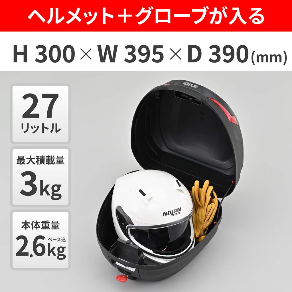 容量27リットルのモノロックケース。フルフェイスヘルメット1つと小物が収納できるコンパクトサイズ。蓋を閉めるだけでロックができるプッシュダウンクローズシステムを採用。シェルには、丈夫で長持ちし時間が経っても色あせしにくいGIVI独自開発素材の「テクノポリマー」を使用しています。モノロック用の汎用ベース付属。・ボックス外寸:奥行390×幅395×高さ300mm・総重量(ベースプレート込み):2.6kg・最大積載重量:3.0kgバイク用リアトップケース(モノロック)コンパクトでヘルメット1個と小物が入るサイズ容量:27L、最大積載重量:3.0kg外寸:奥行390×幅395×高さ300(mm) / 重量(ベースプレート込み):2.6kg商品構成:ボックス本体、汎用モノロックベース※キャリア本体の積載制限以上は積載しないでください。※防水性を考慮した設計をしておりますが、完全防水ではありません。※レンズ部に防水性はありません。※構造上カギの閉じ込み(インロック)ができてしまいます。十分ご注意してください。※商品の仕様上、上下ボタンの押し込み具合は渋め(深め)です。ケースを手でささえながらボタンを奥までしっかり押し込み、確実な操作を行なってください。※商品の仕様上、カギの挿入方向にご注意ください。正しい方向で挿入しないと、ボタンとカギが接触します。※商品付属の汎用ベース、またはM6M(別売り)専用。M5M/MM(別売り)はベースラバーが接触しないため、本品には使用しないでください