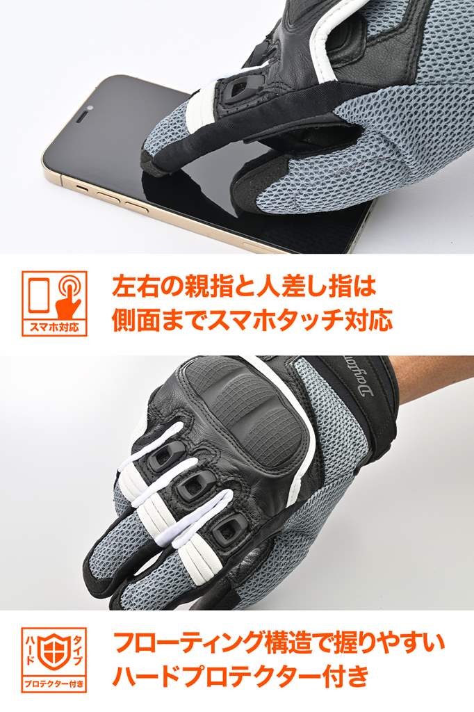 指に装備された通気孔が風を取り込み、真夏のライディンングを快適にします。