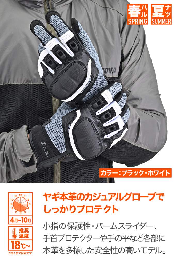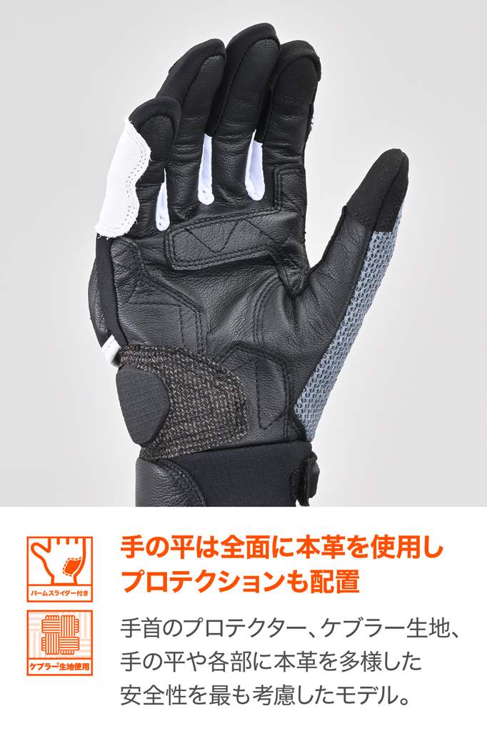 メッシュ+通気孔+本革で通気性と耐久性を両立させた春夏グローブ。手の甲側は通気性とストレッチ性に優れたメッシュ素材、手の平側は転倒やグリップによる摩耗を防ぐ本革を採用。ナックル、指、手首のプロテクターやパームスライダー、ケブラー生地に加えて手の平や各部に本革を多用した安全性の高いモデル。指に装備された通気孔が風を取り込み、真夏のライディンングを快適にします。指先にはストレッチ素材やシャーリングを施し、フローティング構造によりグリップが握りやすく快適に操作できます。・素材:ヤギ革(表地)/ポリエステル/ナイロン/ネオプレン/ケブラーシーズン:春夏通気性の高いメッシュ素材と、指部分に通気孔を装備。ストレッチ性の優れたメッシュ生地で握りやすいパームスライダーや指プロテクター、手首のプロテクター、ケブラー生地を採用し安全性を配慮転倒やグリップとの摩耗を考慮し手の平に本革を使用。摩耗性に優れるケブラーパッチを手の平に採用タッチパネル対応※手とグローブの密着度によりタッチパネルの感度は異なります。